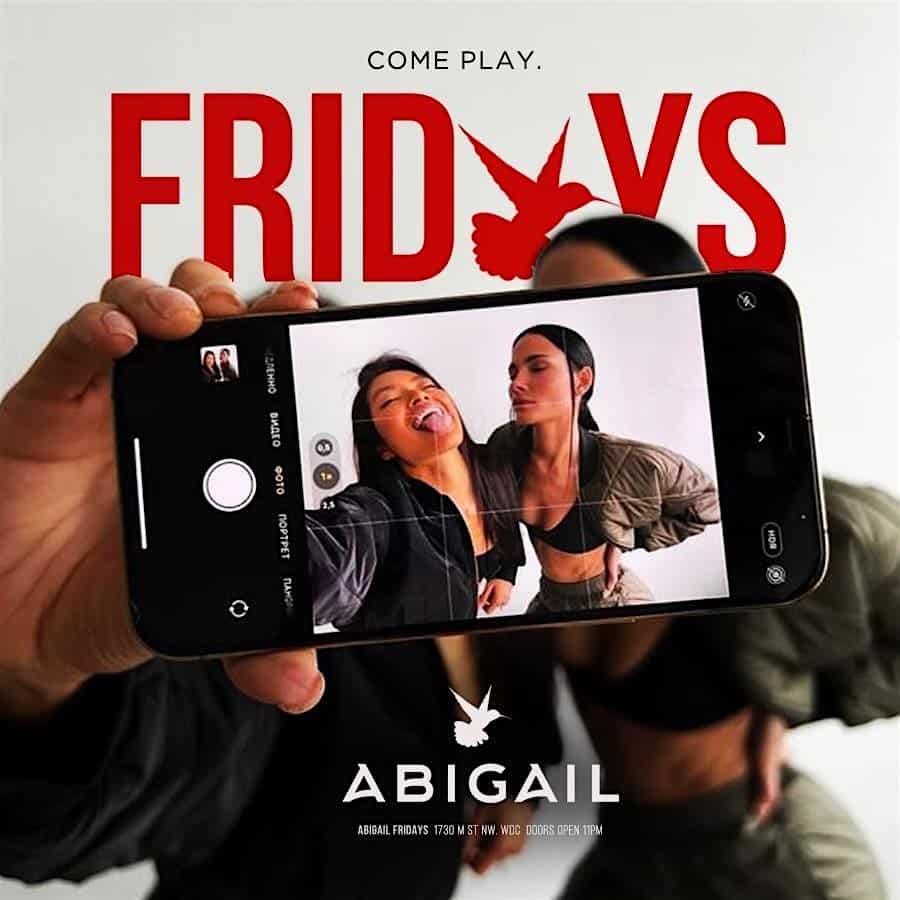 by admin23Feb ABIGAIL FRIDAYS! at Abigail – Washington, DC ABIGAIL FRIDAYS! at Abigail – Washington, DC 2 2 people viewed this event. Get Ready to kick off the weekend in style with Abigail Fridays – the ultimate party experience you don’t want to miss! Doors open 11pm-3am Tickets-RSVP Link Date And Time Friday, April 3rd, 2026 11:00 PM (PST) Venue Abigail Location 1730 M Street Northwest, Washington, DC 20036 Event Types MusicParty or Social Gathering Event Category Washington DC Share With Friends Facebook Twitter Linkedin Xing Pinterest Share This Post: