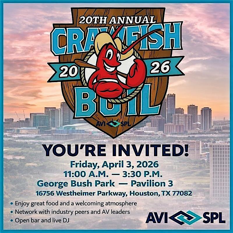by admin24Feb AVI-SPL Crawfish Boil at 16756 Westheimer Pkwy – Houston, TX AVI-SPL Crawfish Boil at 16756 Westheimer Pkwy – Houston, TX 1 1 people viewed this event. Get ready to crack some shells and enjoy a Louisiana-style feast at the AVI-SPL 20th Annual Crawfish Boil! Enjoy Music and Open Bar! Tickets-RSVP Link Date And Time Friday, April 3rd, 2026 11:00 AM (PST) Venue 16756 Westheimer Pkwy Location 16756 Westheimer Parkway, Houston, TX 77082 Event Types Food & DrinkParty or Social Gathering Event Category HoustonTexas Share With Friends Facebook Twitter Linkedin Xing Pinterest Share This Post: