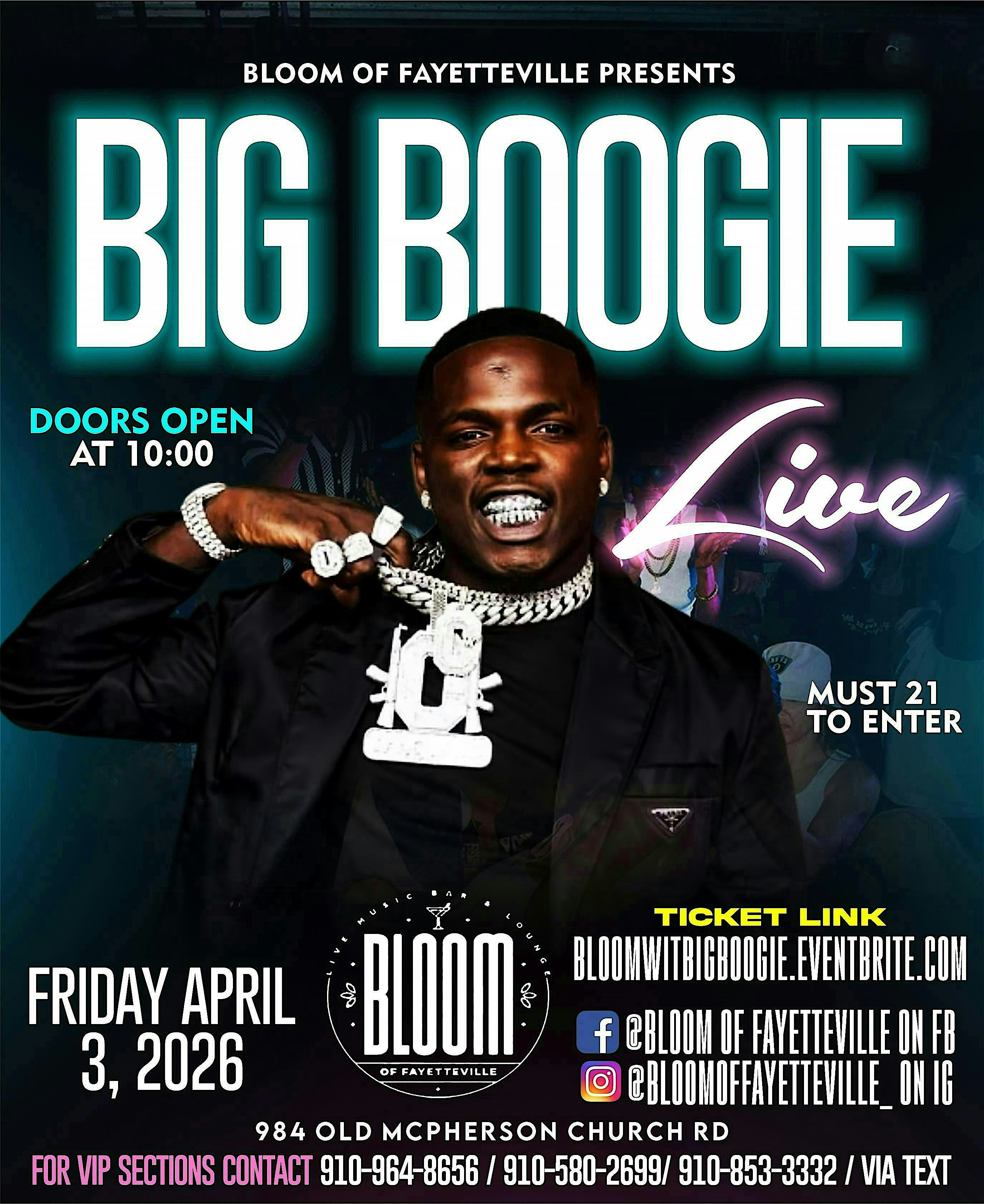 by admin27Feb BIG BOOGIE LIVE @ BLOOM OF FAYETTEVILLE at Bloom of Fayetteville – Fayetteville, NC BIG BOOGIE LIVE @ BLOOM OF FAYETTEVILLE at Bloom of Fayetteville – Fayetteville, NC 2 2 people viewed this event. BIG BOOGIE LIVE @ BLOOM OF FAYETTEVILLE!!! FRIDAY APRIL 3, 2026. DOORS OPEN @10:00PM. DRAMA FREE VIBES & SECURITY WILL BE STRICTLY ENFORCED. Tickets-RSVP Link Date And Time Friday, April 3rd, 2026 10:00 PM (PST) Venue Bloom of Fayetteville Location 984 South Old McPherson Church Road, Fayetteville, NC 28303 Event Types Concert or PerformanceMusic Event Category North Carolina Share With Friends Facebook Twitter Linkedin Xing Pinterest Share This Post: