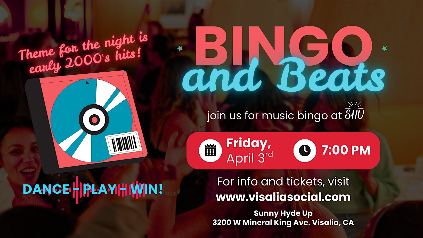 by admin27Feb Bingo & Beats: 2000s Throwback Edition at Sunny Hyde Up – Visalia, CA Bingo & Beats: 2000s Throwback Edition at Sunny Hyde Up – Visalia, CA 2 2 people viewed this event. Get ready to groove and dab your way through a night of Bingo and Beats – it’s going to be lit! Tickets-RSVP Link Date And Time Friday, April 3rd, 2026 @ 06:00 PM Location 3200 West Mineral King Avenue, Visalia, CA 93291 Event Types MusicParty or Social Gathering Event Category California Share With Friends Facebook Twitter Linkedin Xing Pinterest Share This Post: