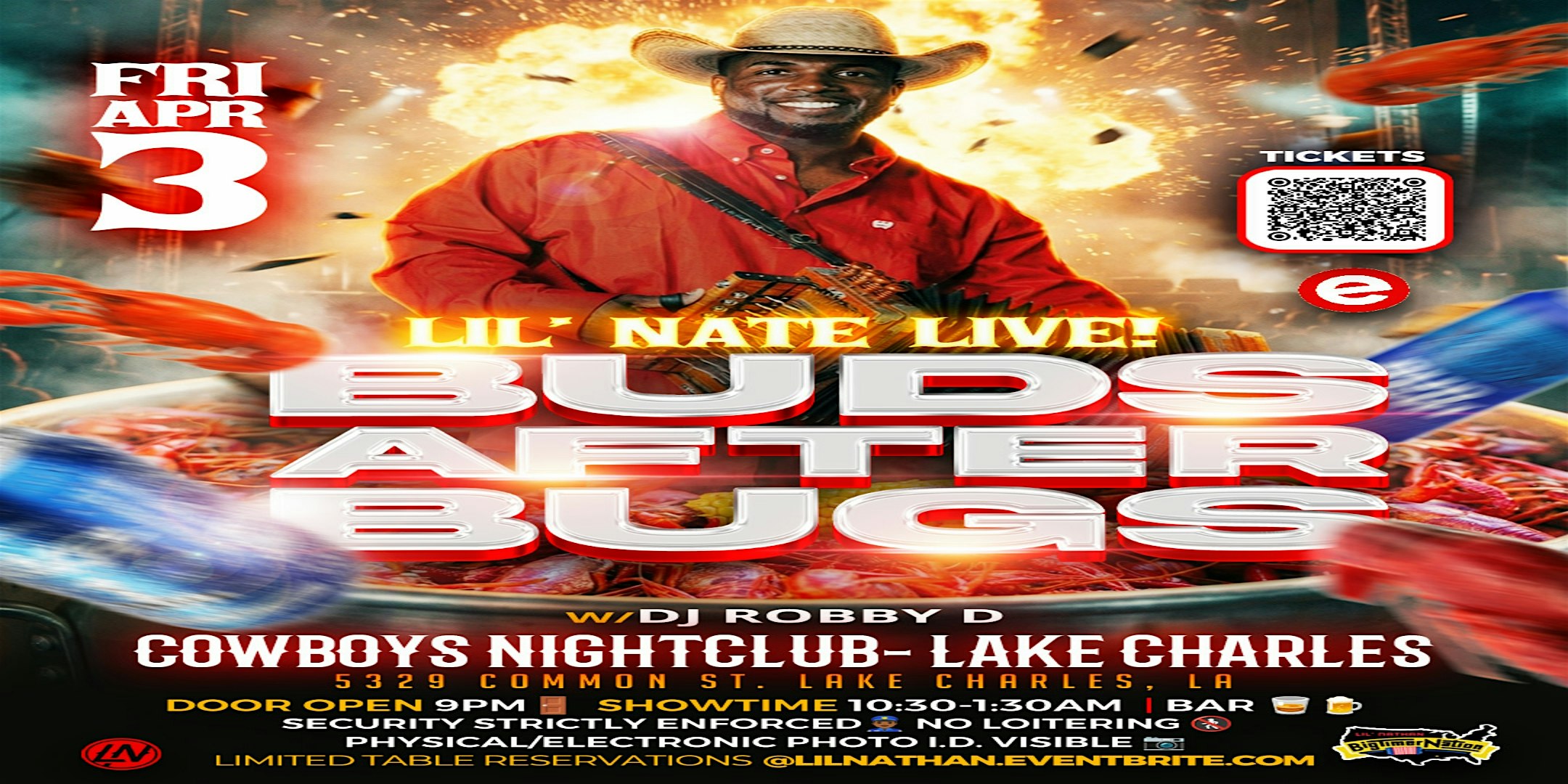 by admin24Feb BUDS AFTER BUGS w/ LIL’ NATE & DJ ROBBY D at Cowboys Lake Charles – Lake Charles, LA BUDS AFTER BUGS w/ LIL’ NATE & DJ ROBBY D at Cowboys Lake Charles – Lake Charles, LA 2 2 people viewed this event. Tickets-RSVP Link Date And Time Friday, April 3rd, 2026 10:00 PM (PST) Venue Cowboys Lake Charles Location 5329 Common Street, Lake Charles, LA 70605 Event Types Concert or PerformanceMusic Event Category Louisiana Share With Friends Facebook Twitter Linkedin Xing Pinterest Share This Post: