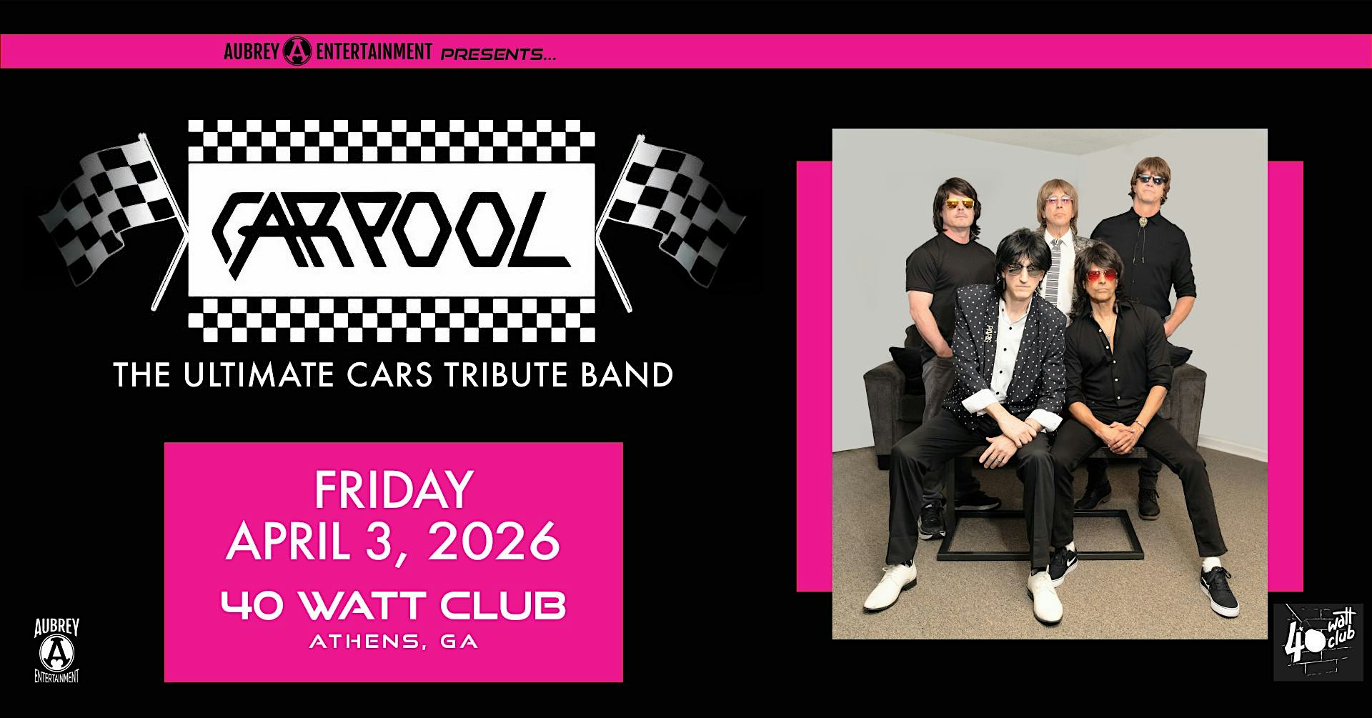 by admin13Feb CARPOOL (the #1 Cars Tribute Band) at 40 Watt Club – Athens, GA CARPOOL (the #1 Cars Tribute Band) at 40 Watt Club – Athens, GA 1 1 people viewed this event. CARPOOL (the #1 Cars Tribute Band ) Tickets-RSVP Link Date And Time Friday, April 3rd, 2026 11:00 PM (PST) Venue 40 Watt Club Location 285 West Washington St, Athens, GA 30601 Event Types Concert or PerformanceMusic Event Category Georgia Share With Friends Facebook Twitter Linkedin Xing Pinterest Share This Post: