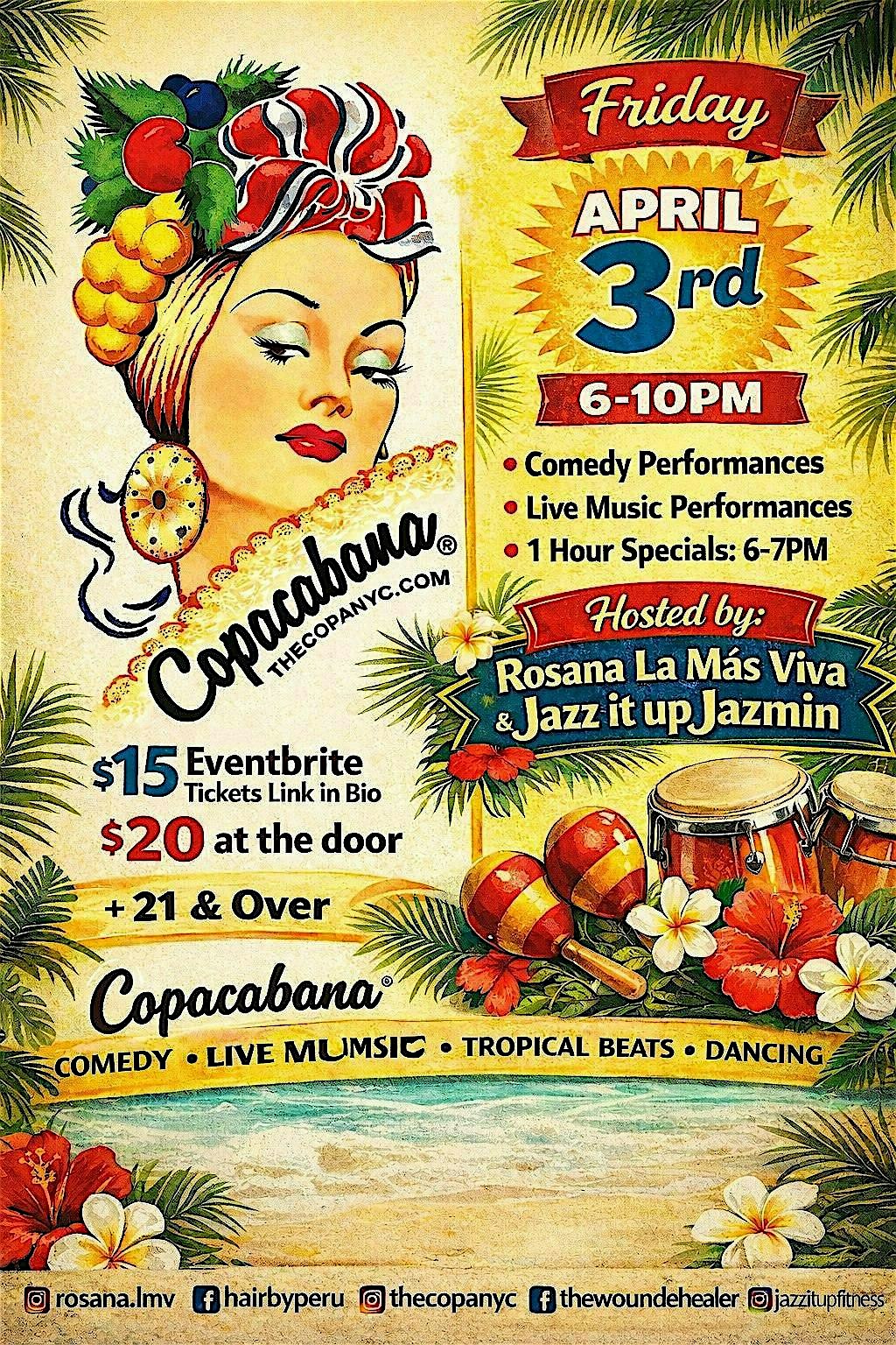 by admin13Feb Copa Cabanas “Ritmo && Laughs” at Copacabana Nightclub – New York, NY Copa Cabanas “Ritmo && Laughs” at Copacabana Nightclub – New York, NY 2 2 people viewed this event. Ven a Copa Cabañas “Ritmo && Laughs” y disfruta de buena música y risas en vivo, ¡no te lo pierdas! Tickets-RSVP Link Date And Time Friday, April 3rd, 2026 10:00 PM (PST) Venue Copacabana Nightclub Location 625 West 51st Street, New York, NY 10019 Event Types Community & CultureParty or Social Gathering Event Category New YorkNew York City Share With Friends Facebook Twitter Linkedin Xing Pinterest Share This Post: