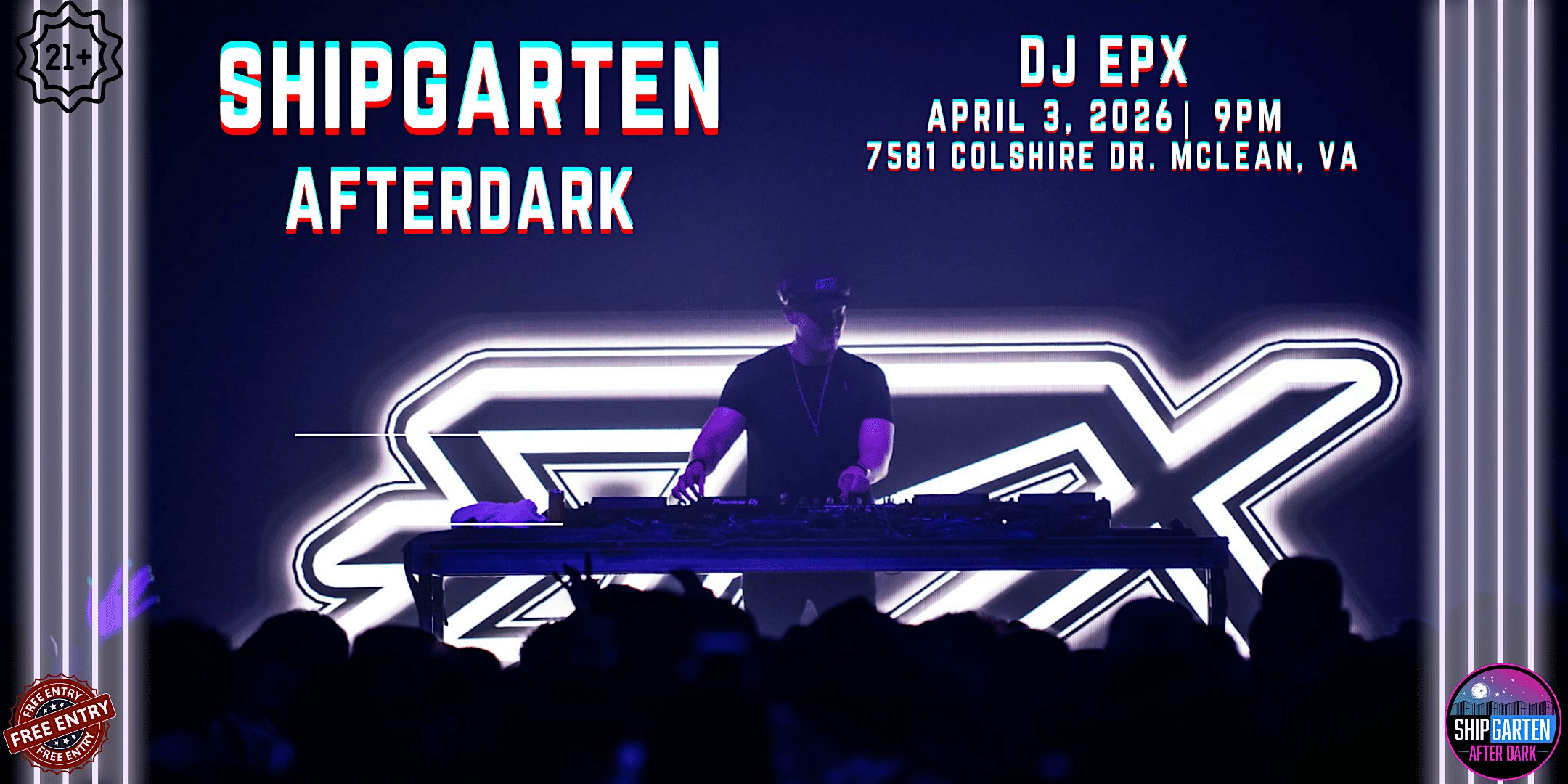 by admin24Feb DJ EPX for Shipgarten After Dark at 7581 Colshire Dr – Tysons, VA DJ EPX for Shipgarten After Dark at 7581 Colshire Dr – Tysons, VA 3 3 people viewed this event. Shipgarten After Dark – 21+ Night Featuring a Special Guest DJ Tickets-RSVP Link Date And Time Friday, April 3rd, 2026 09:00 PM (PST) Venue 7581 Colshire Dr Location 7581 Colshire Drive, Tysons, VA 22102 Event Types Concert or PerformanceMusic Event Category Virginia Share With Friends Facebook Twitter Linkedin Xing Pinterest Share This Post: