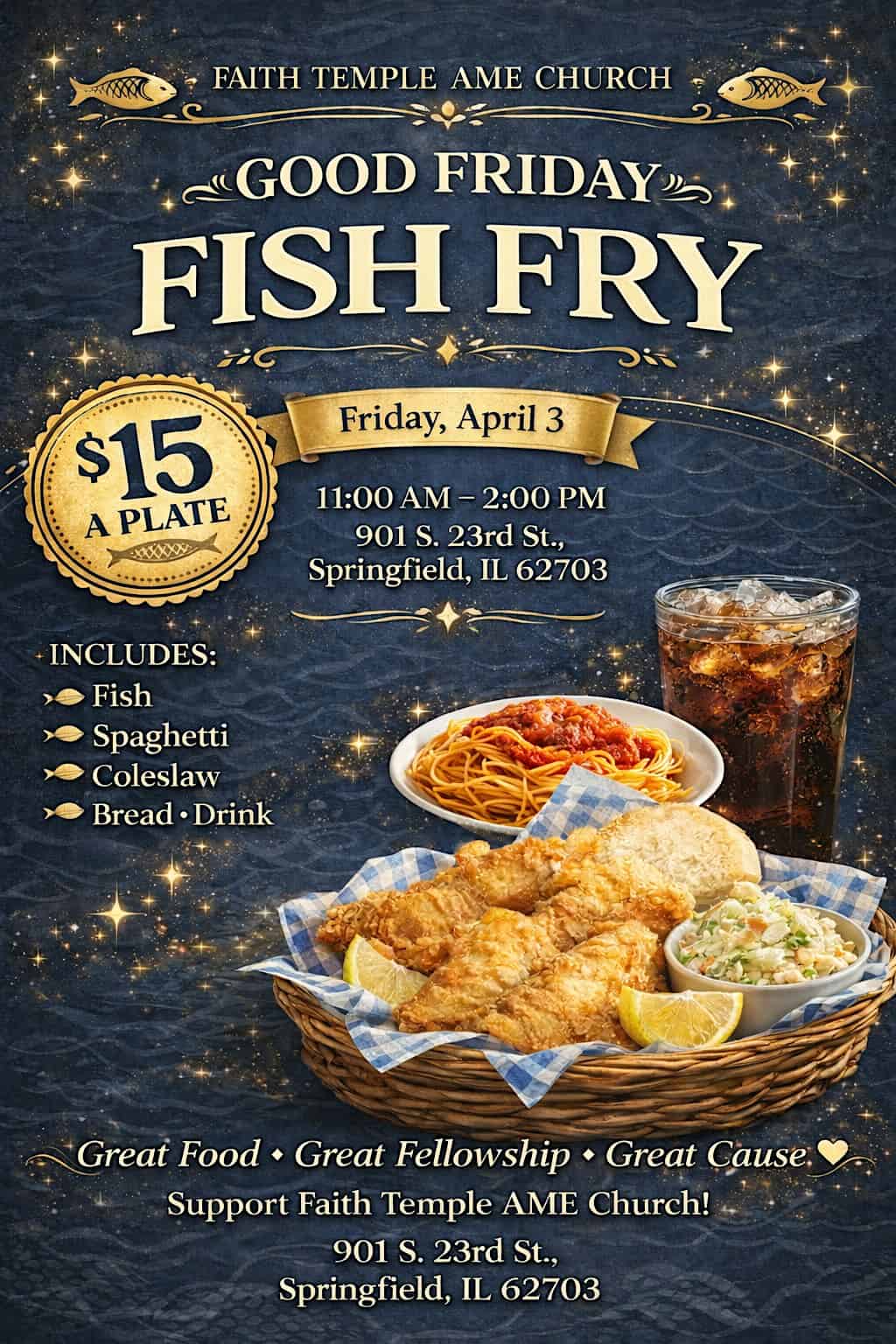 by admin14Feb Faith Temple Good Friday Fish Fry at Faith Temple AME Church – Springfield, IL Faith Temple Good Friday Fish Fry at Faith Temple AME Church – Springfield, IL 1 1 people viewed this event. Join us for Great Good, Great Fellowship and a Great Cause! Tickets-RSVP Link Date And Time Friday, April 3rd, 2026 04:00 PM (PST) Venue Faith Temple AME Church Location 901 South 23rd Street, Springfield, IL 62703 Event Types Festival or FairFood & Drink Event Category Illinois Share With Friends Facebook Twitter Linkedin Xing Pinterest Share This Post:
