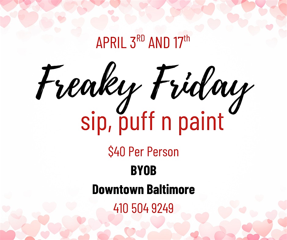 by admin27Feb Freaky Fridays! Sip, Puff n Paint @ Baltimore’s BEST Art Gallery!! at The Gallery About Nothing – Baltimore, MD Freaky Fridays! Sip, Puff n Paint @ Baltimore’s BEST Art Gallery!! at The Gallery About Nothing – Baltimore, MD 2 2 people viewed this event. Come out, get creative and have a great time!! Tickets-RSVP Link Date And Time Friday, April 3rd, 2026 @ 09:00 PM Location 805 East Baltimore Street, Baltimore, MD 21202 Event Types Party or Social GatheringPerforming & Visual Arts Event Category BaltimoreMaryland Share With Friends Facebook Twitter Linkedin Xing Pinterest Share This Post: