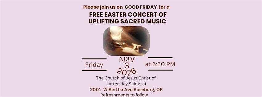 by admin24Feb Free Easter Music Celebration of Inspiring Music at The Church of Jesus Christ of Latter-day Saints – Roseburg, OR Free Easter Music Celebration of Inspiring Music at The Church of Jesus Christ of Latter-day Saints – Roseburg, OR 2 2 people viewed this event. Tickets-RSVP Link Date And Time Friday, April 3rd, 2026 06:00 PM (PST) Venue The Church of Jesus Christ of Latter-day Saints Location 2001 West Bertha Avenue, Roseburg, OR 97471-2724 Event Types Music Event Category Oregon Share With Friends Facebook Twitter Linkedin Xing Pinterest Share This Post: