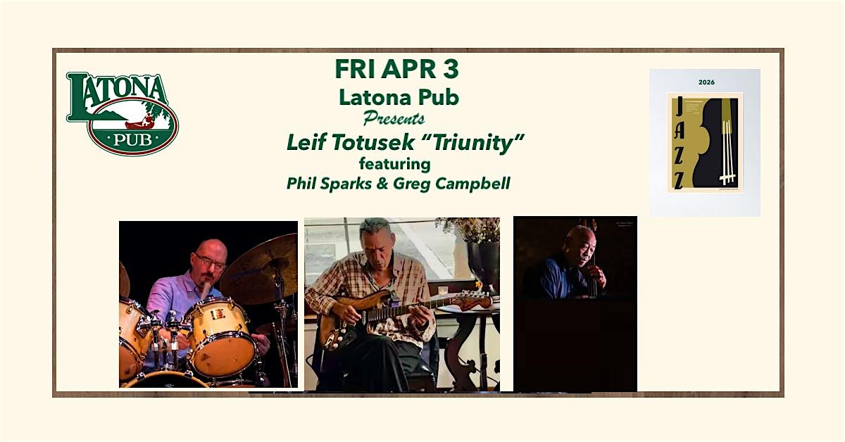 by admin24Feb Latona Pub Presents … Leif Totusek “Triunity” at Latona Pub – Seattle, WA Latona Pub Presents … Leif Totusek “Triunity” at Latona Pub – Seattle, WA 3 3 people viewed this event. Catch Leif Totusek live at Latona Pub with his new vibes on “Triunity” — a night you don’t wanna miss! Tickets-RSVP Link Date And Time Friday, April 3rd, 2026 05:00 PM (PST) Venue Latona Pub Location 6423 Latona Ave NE, Seattle, WA 98115 Event Types Concert or PerformanceMusic Event Category SeattleWashington Share With Friends Facebook Twitter Linkedin Xing Pinterest Share This Post: