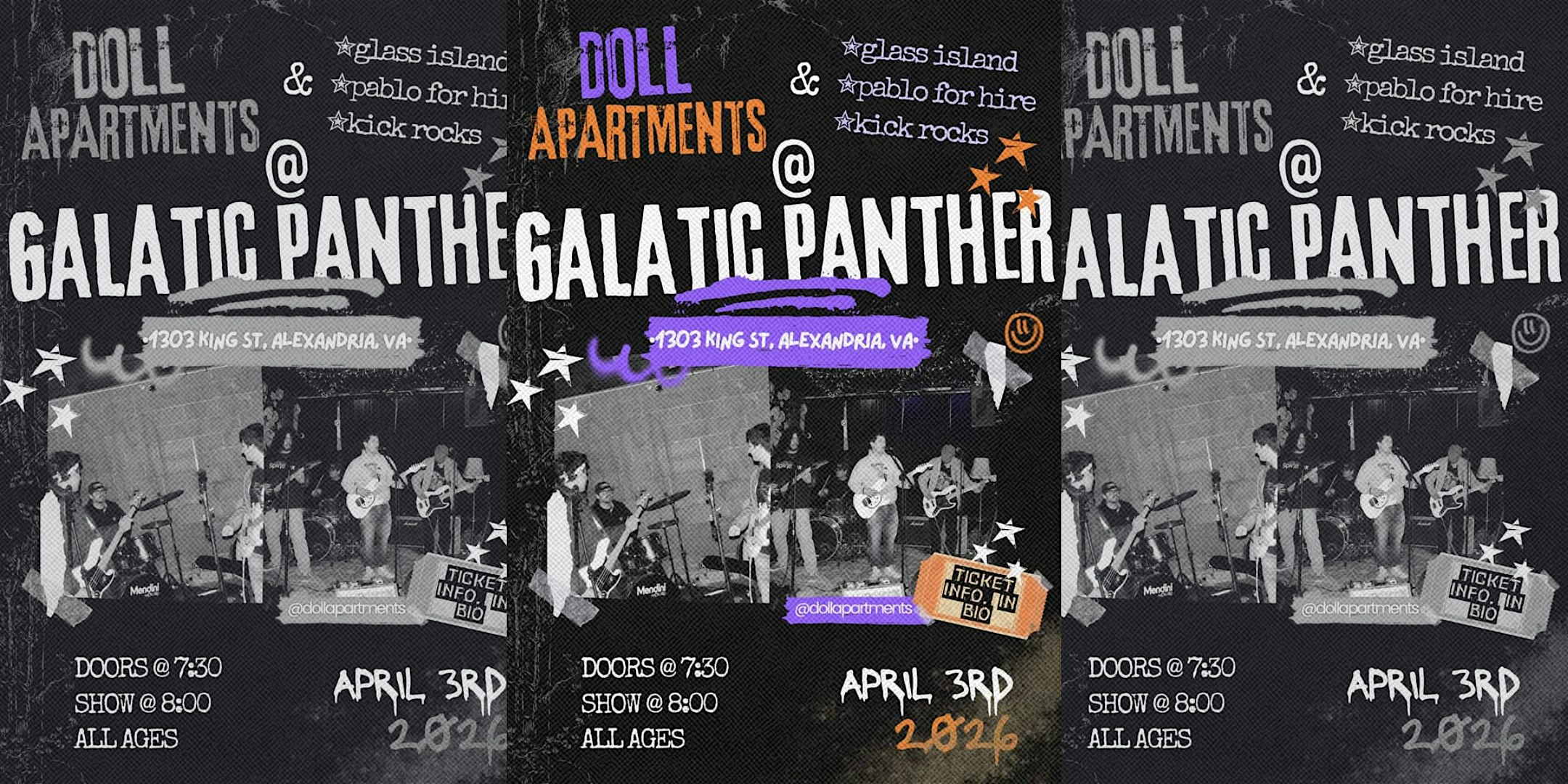 by admin24Feb LIVE MUSIC: Doll Apartments + Kick Rocks at Galactic Panther Art Gallery – Alexandria, VA LIVE MUSIC: Doll Apartments + Kick Rocks at Galactic Panther Art Gallery – Alexandria, VA 2 2 people viewed this event. A fun friday show with someone of the best underground indie music that the DMV has to offer. Tickets-RSVP Link Date And Time Friday, April 3rd, 2026 08:00 PM (PST) Venue Galactic Panther Art Gallery Location 1303 King st, Alexandria, VA 22314 Event Types Concert or PerformanceMusic Event Category Virginia Share With Friends Facebook Twitter Linkedin Xing Pinterest Share This Post: