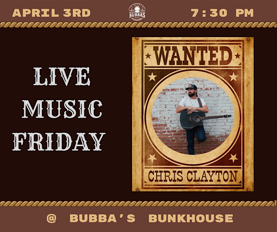 by admin24Feb Live Music Friday @ Bubba’s – Chris Clayton at Bubba’s Bunkhouse – Harrisburg, NC Live Music Friday @ Bubba’s – Chris Clayton at Bubba’s Bunkhouse – Harrisburg, NC 1 1 people viewed this event. Get ready to rock out with Chris Clayton this Friday at Bubba’s – it’s going to be a night to remember! Tickets-RSVP Link Date And Time Friday, April 3rd, 2026 07:00 PM (PST) Venue Bubba's Bunkhouse Location 4351 Main Street, Harrisburg, NC 28075 Event Types Concert or PerformanceMusic Event Category North Carolina Share With Friends Facebook Twitter Linkedin Xing Pinterest Share This Post: