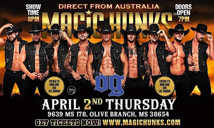 by admin14Feb MAGIC HUNKS® AUSTRALIAN TAKEOVER IN OLIVE BRANCH, MS, USA!! at The OG Bar – Olive Branch, MS MAGIC HUNKS® AUSTRALIAN TAKEOVER IN OLIVE BRANCH, MS, USA!! at The OG Bar – Olive Branch, MS 2 2 people viewed this event. Australia’s Ultimate Ladies Night Event Is Coming to Olive Branch! Limited Tickets On Sale NOW! Open to Ages 21+ Doors open at 7pm Tickets-RSVP Link Date And Time Friday, April 3rd, 2026 01:00 AM (PST) Venue The OG Bar Location 9639 Mississippi 178, Olive Branch, MS 38654 Event Types Concert or PerformancePerforming & Visual Arts Event Category Mississippi Share With Friends Facebook Twitter Linkedin Xing Pinterest Share This Post: