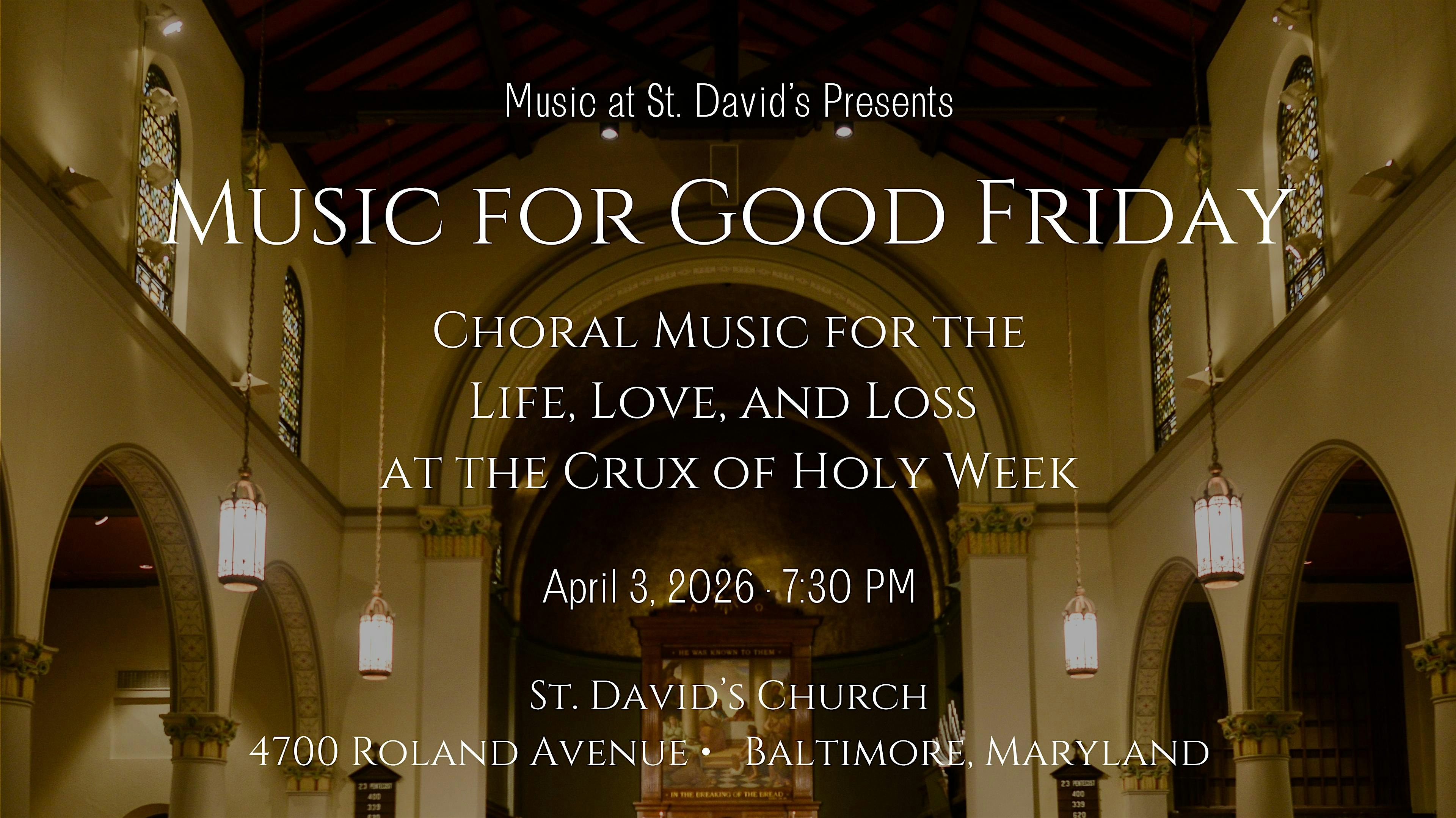 by admin13Feb Music for Good Friday at Saint Davids Episcopal Church – Baltimore, MD Music for Good Friday at Saint Davids Episcopal Church – Baltimore, MD 2 2 people viewed this event. Join the Choir of St. David’s for a program of choral and organ music exploring the love, life, and loss at the crux of Holy Week. Tickets-RSVP Link Date And Time Friday, April 3rd, 2026 11:00 PM (PST) Venue Saint Davids Episcopal Church Location 4700 Roland Avenue, Baltimore, MD 21210 Event Types Concert or PerformanceMusic Event Category BaltimoreMaryland Share With Friends Facebook Twitter Linkedin Xing Pinterest Share This Post:
