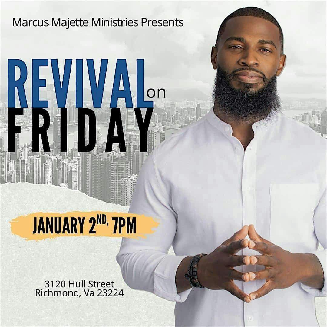 by admin14Feb Revival on Friday at 3120 Hull Street Rd – Richmond, VA Revival on Friday at 3120 Hull Street Rd – Richmond, VA 1 1 people viewed this event. REVIVAL ON FRIDAY IS A POWERFUL WORSHIP EXPERIENCE HOSTED BY MARCUS MAJETTE MINISTRIES EVERY FIRST FRIDAY OF THE MONTH. Tickets-RSVP Link Date And Time Friday, April 3rd, 2026 11:00 PM (PST) Venue 3120 Hull Street Rd Location 3120 Hull Street Road, Richmond, VA 23224 Event Types Concert or Performance Event Category Virginia Share With Friends Facebook Twitter Linkedin Xing Pinterest Share This Post: