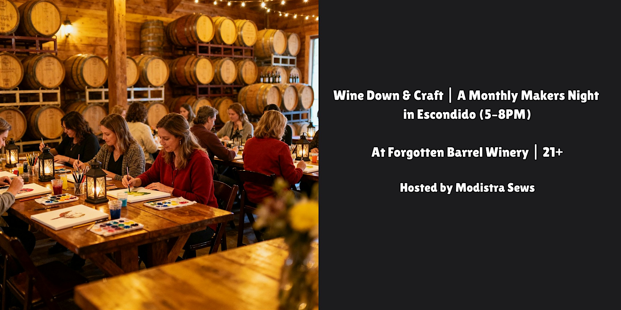 by admin24Feb Wine Down & Craft | A Monthly Makers Night in Escondido (5–8PM) at 1120 W 15th Ave – Escondido, CA Wine Down & Craft | A Monthly Makers Night in Escondido (5–8PM) at 1120 W 15th Ave – Escondido, CA 1 1 people viewed this event. Wine Down & Craft is a relaxed, social craft night held at Forgotten Barrel Winery where makers of all kinds gather to sip and create. Tickets-RSVP Link Date And Time Friday, April 3rd, 2026 05:00 PM (PST) Venue 1120 W 15th Ave Location 1120 West 15th Avenue, Escondido, CA 92025 Event Types Party or Social Gathering Event Category California Share With Friends Facebook Twitter Linkedin Xing Pinterest Share This Post: