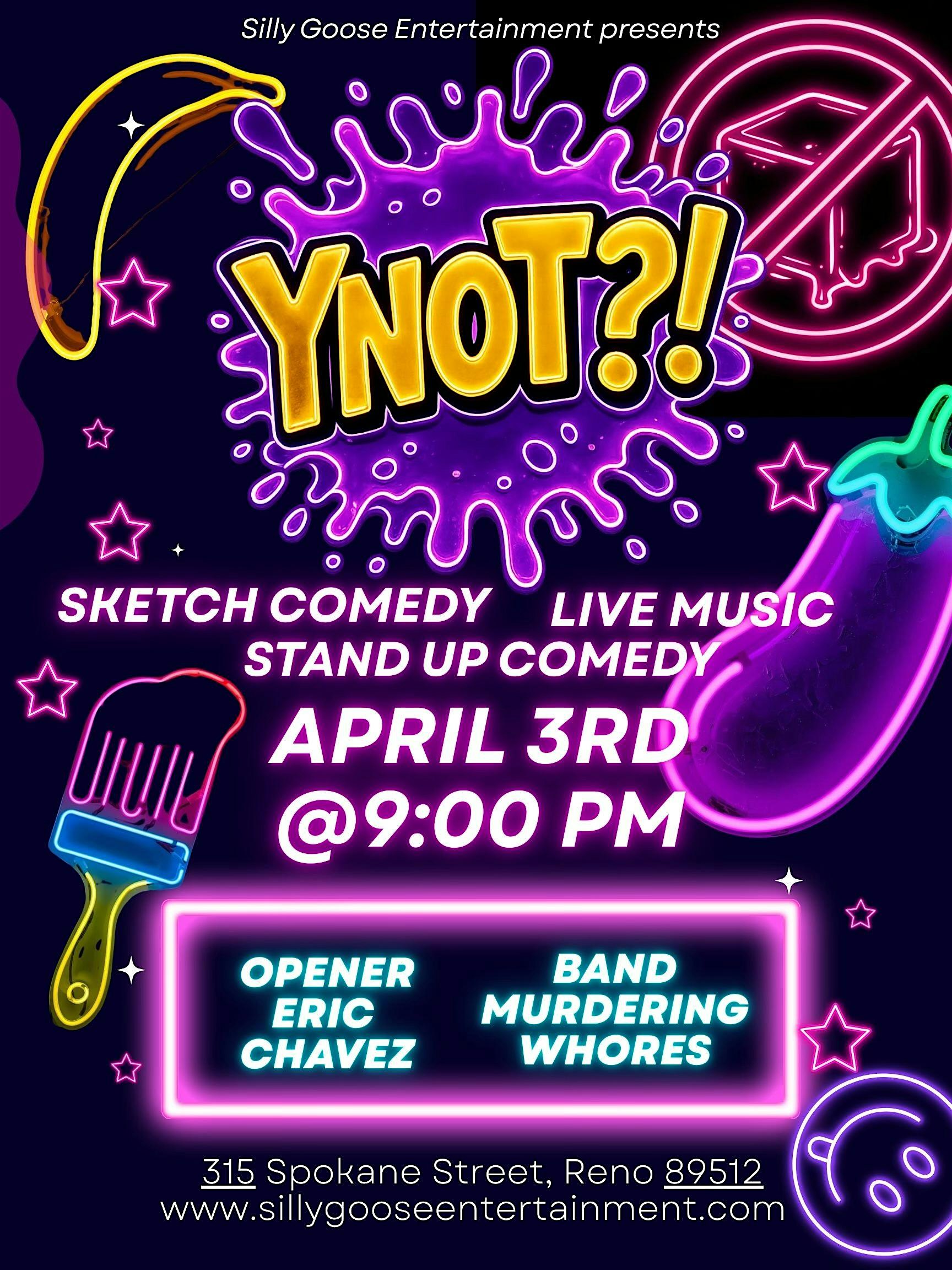 YNOT?! Live Comedy Sketch Show at 315 Spokane St – Reno, NV YNOT?! Live Comedy Sketch Show at 315 Spokane St – Reno, NV 2 2 people viewed this event. Were back with episode 5?! We cant believe it either. Weve sold out our last 3 episodes! Dont miss this one!! sillygooseentertainment.com for TICKETS! Become a studio audience member and checkout our merch. Tickets-RSVP Link Register for event Date And Time Friday, April 3rd, 2026 @ 09:00 PM Location 315 Spokane Street, Reno, NV 89512 Event Types ComedyConcert or PerformancePerforming & Visual Arts Event Category NevadaReno Share With Friends Facebook Twitter Linkedin Xing Pinterest