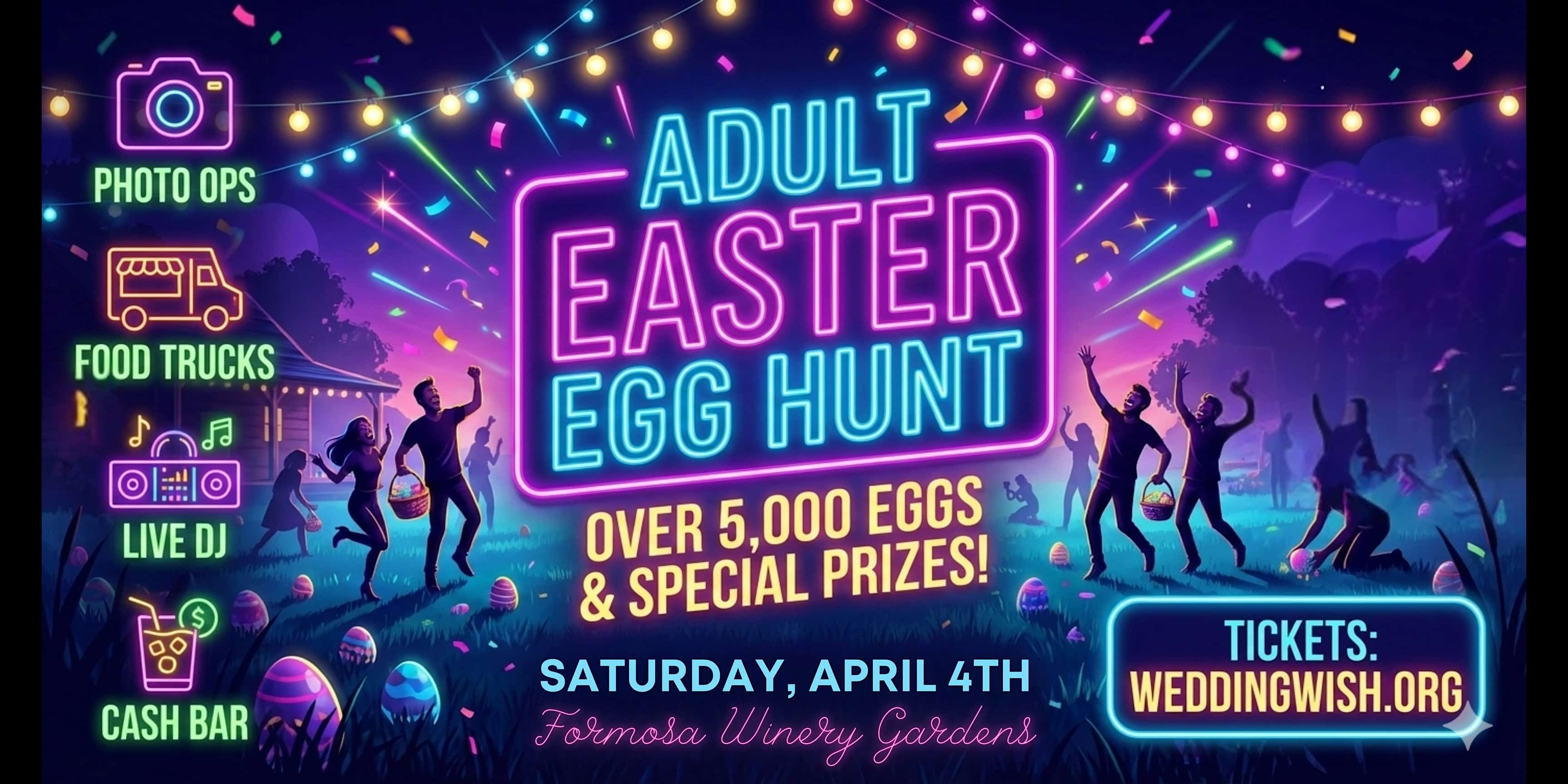 by admin23Feb Adult Easter Egg Hunt at Formosa Gardens Boulevard – Kissimmee, FL Adult Easter Egg Hunt at Formosa Gardens Boulevard – Kissimmee, FL 2 2 people viewed this event. Have fun hunting for more than 5,000 eggs with treats, cash, lotto tix, adult beverages, coupons, gift certificates and more! Tickets-RSVP Link Date And Time Saturday, April 4th, 2026 05:00 PM (PST) Venue Formosa Gardens Boulevard Location Formosa Gardens Boulevard, Kissimmee, FL 34747 Event Types Party or Social GatheringSeasonal & Holiday Event Category FloridaOrlando Share With Friends Facebook Twitter Linkedin Xing Pinterest Share This Post: