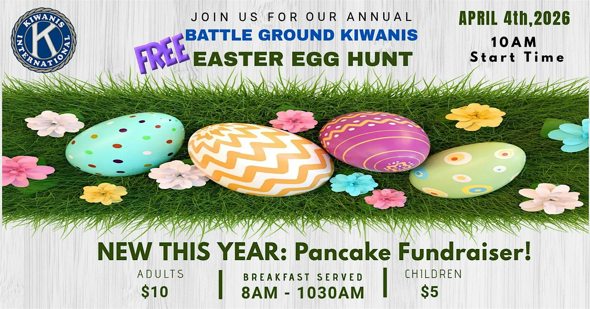 by admin13Feb Annual Battle Ground Kiwanis Free Easter Egg Hunt & Pancake Fundraiser at Kiwanis Park – Battle Ground, WA Annual Battle Ground Kiwanis Free Easter Egg Hunt & Pancake Fundraiser at Kiwanis Park – Battle Ground, WA 1 1 people viewed this event. Join us for a hopping good time at the Annual Battle Ground Kiwanis Free Easter Egg Hunt & Pancake Fundraiser! Tickets-RSVP Link Date And Time Saturday, April 4th, 2026 05:00 PM (PST) Venue Kiwanis Park Location 422 Southwest 2nd Avenue, Battle Ground, WA 98604 Event Types Party or Social GatheringSeasonal & Holiday Event Category Washington Share With Friends Facebook Twitter Linkedin Xing Pinterest Share This Post: