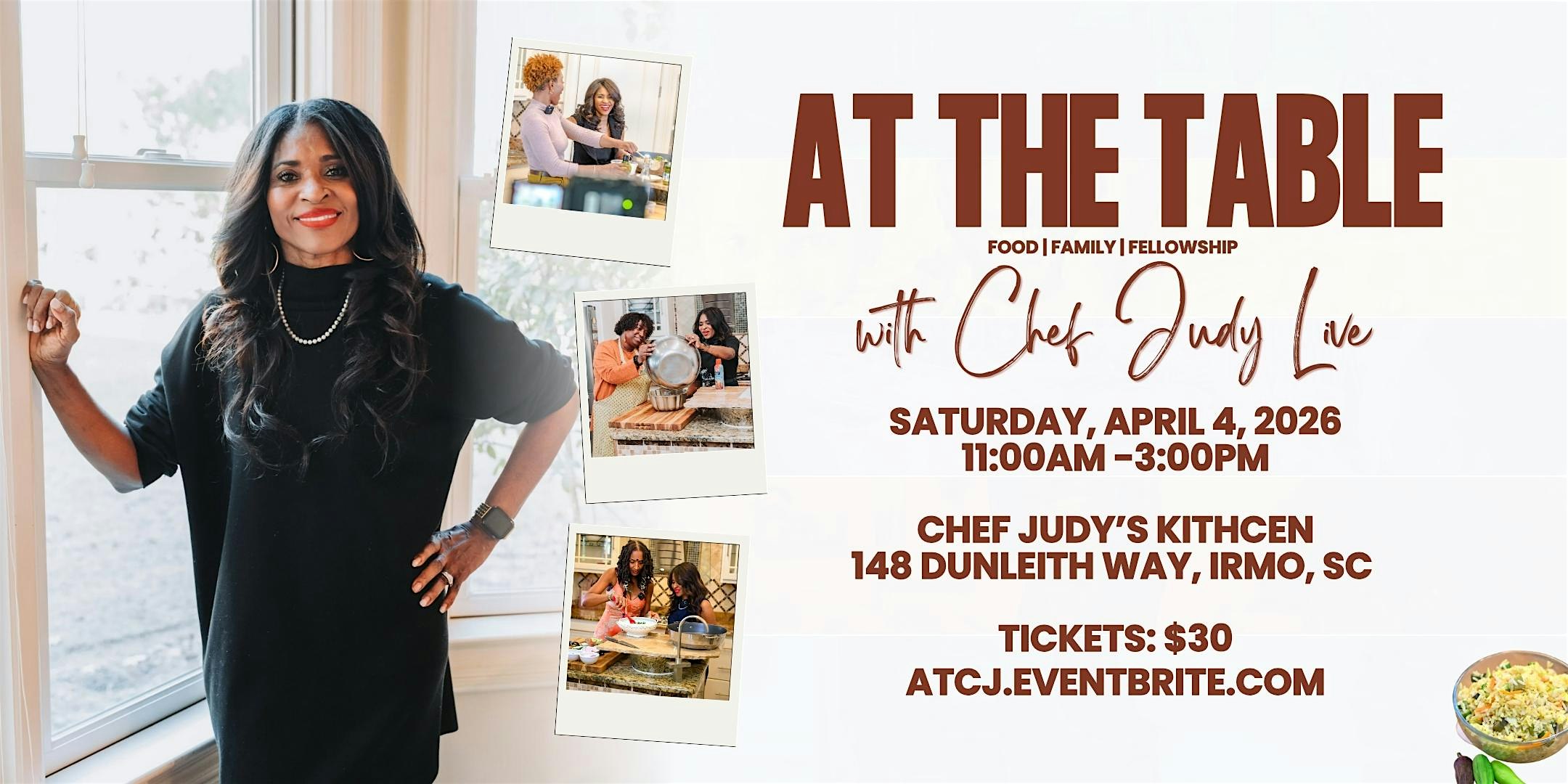 At The Table With Chef Judy Live (April) at 148 Dunleith Way – Irmo, SC At The Table With Chef Judy Live (April) at 148 Dunleith Way – Irmo, SC 1 1 people viewed this event. Chef Judy Live (4/4)! Taste dishes & hear the memories inspiring her new cookbook. Learn secrets, network, & be a recipe insider! Tickets-RSVP Link Register for event Date And Time Saturday, April 4th, 2026 @ 11:00 AM Location 148 Dunleith Way, Irmo, SC 29063 Event Types Food & DrinkMeeting or Networking Event Event Category South Carolina Share With Friends Facebook Twitter Linkedin Xing Pinterest