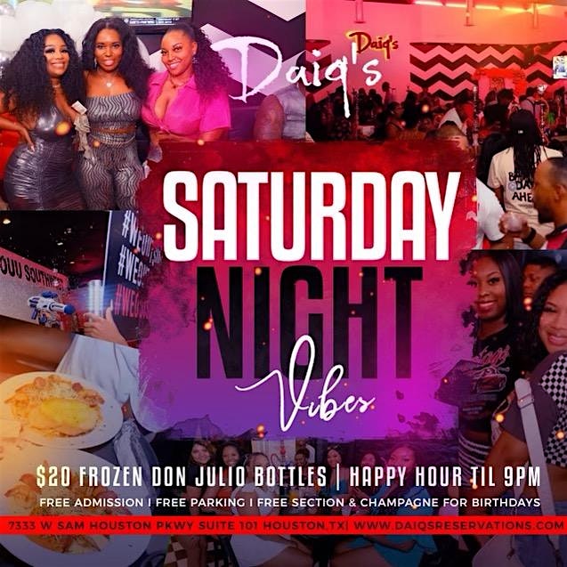 by admin24Feb DAIQ’s On Saturdays! at Daiq’s – Houston, TX DAIQ’s On Saturdays! at Daiq’s – Houston, TX 2 2 people viewed this event. Saturday-Brunch/Nitelife at “DAIQ’s On Saturdays!” $7 Premiums til 6, $12 Lemon Drops & Side Cars 6-2, $60 Fireworks Towers ALL DAY Tickets-RSVP Link Date And Time Saturday, April 4th, 2026 07:00 PM (PST) Venue Daiq's Location 7333 West Sam Houston Parkway South, Houston, TX 77072 Event Types Food & DrinkParty or Social Gathering Event Category HoustonTexas Share With Friends Facebook Twitter Linkedin Xing Pinterest Share This Post:
