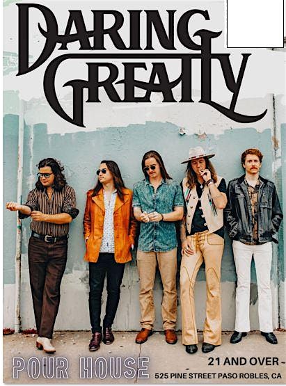by admin24Feb DARING GREATLY live at The Pour House in Paso! VIP Table Sales. at 525 Pine St – Paso Robles, CA DARING GREATLY live at The Pour House in Paso! VIP Table Sales. at 525 Pine St – Paso Robles, CA 2 2 people viewed this event. This sale is for VIP tables only- general admission tickets can be purchased at the door. $10 regular price, $5 for locals! Tickets-RSVP Link Date And Time Saturday, April 4th, 2026 07:00 PM (PST) Venue 525 Pine St Location 525 Pine Street, Paso Robles, CA 93446 Event Types Concert or PerformanceMusic Event Category California Share With Friends Facebook Twitter Linkedin Xing Pinterest Share This Post:
