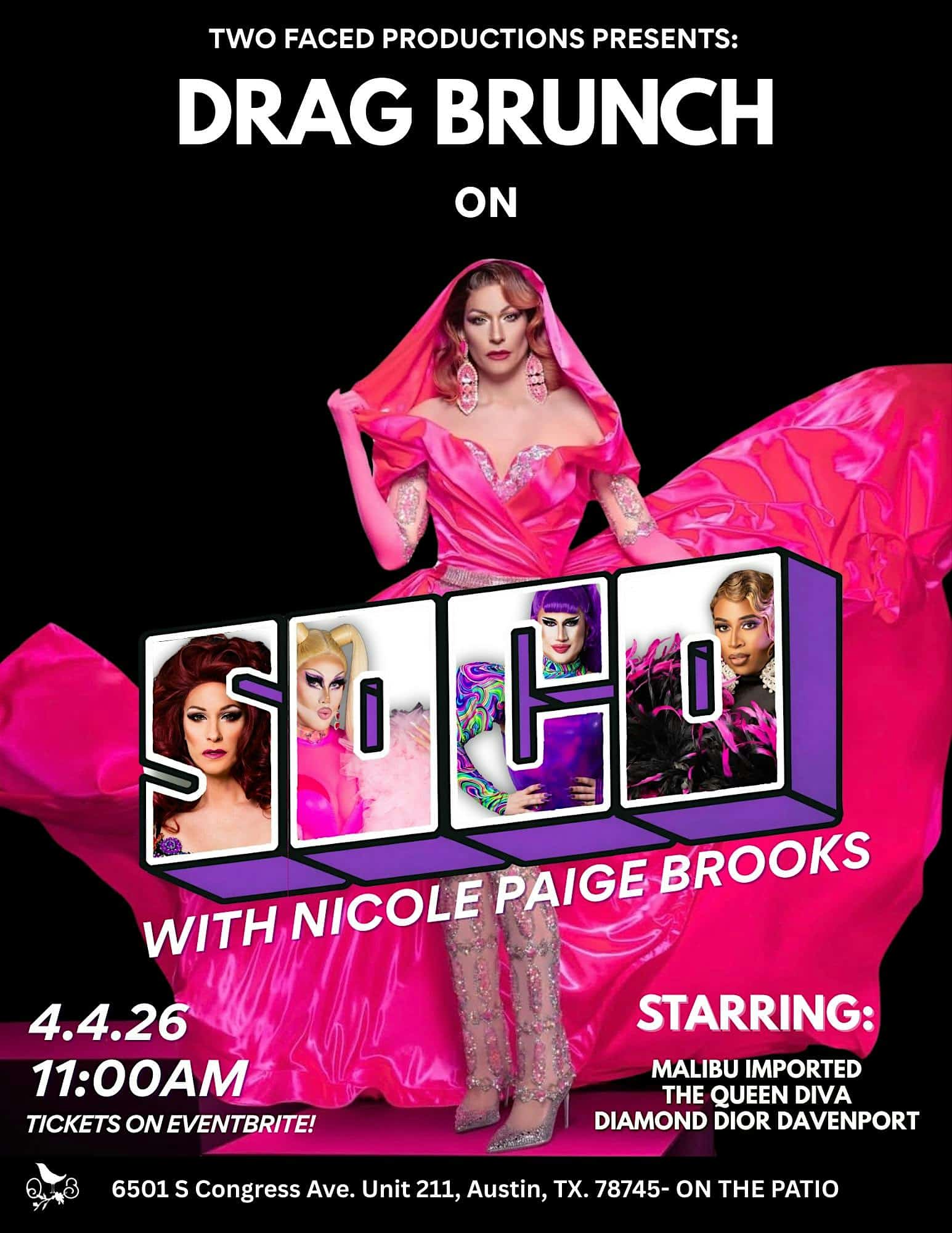 by admin14Feb Drag Brunch on SOCO w/ Nicole Paige Brooks at Ovenbird | Austin – Austin, TX Drag Brunch on SOCO w/ Nicole Paige Brooks at Ovenbird | Austin – Austin, TX 1 1 people viewed this event. From Rupaul’s Drag race Season 2 & All Stars 10, Nicole Paige Brooks- From Atlanta Georgia joins Drag Brunch on SOCO! Tickets-RSVP Link Date And Time Saturday, April 4th, 2026 04:00 PM (PST) Venue Ovenbird | Austin Location 6501 South Congress Avenue, Austin, TX 78745 Event Types Concert or PerformanceFilm, Media & Entertainment Event Category AustinTexas Share With Friends Facebook Twitter Linkedin Xing Pinterest Share This Post: