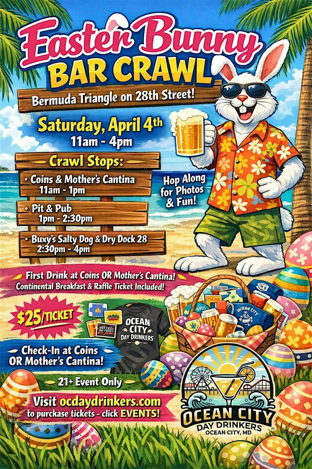 by admin23Feb Easter Bunny Bar Crawl – Bermuda Triangle on 28th Street Edition at Check-in @ Mother’s Cantina or Coins! – Ocean City, MD Easter Bunny Bar Crawl – Bermuda Triangle on 28th Street Edition at Check-in @ Mother’s Cantina or Coins! – Ocean City, MD 4 4 people viewed this event. Saturday, April 4th: 11am – 4pm . Event supports the A.M. Foundation scholarship fund! Tickets-RSVP Link Date And Time Saturday, April 4th, 2026 11:00 AM (PST) Venue Check-in @ Mother's Cantina or Coins! Location 28th Street, Ocean City, MD 21842 Event Types Food & DrinkParty or Social Gathering Event Category Maryland Share With Friends Facebook Twitter Linkedin Xing Pinterest Share This Post: