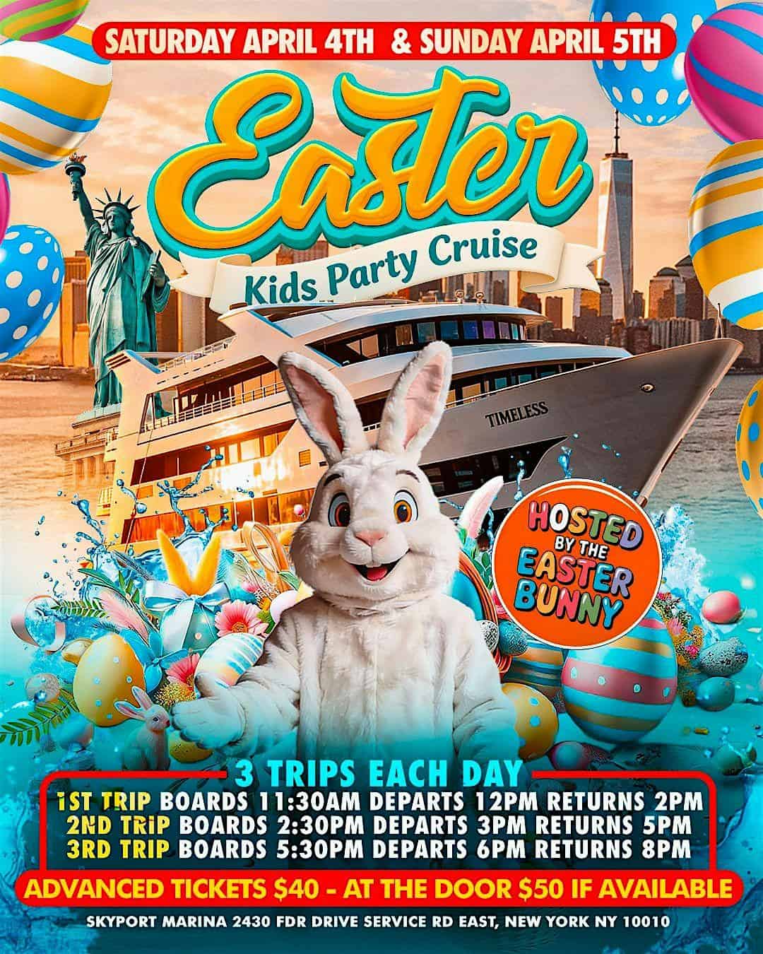 by admin14Feb Easter Kids Party Cruise at Kids Party Cruise – New York, NY Easter Kids Party Cruise at Kids Party Cruise – New York, NY 1 1 people viewed this event. Get ready to set sail on the Easter Kids Party Cruise for a day of fun, games, and surprises! Tickets-RSVP Link Date And Time Saturday, April 4th, 2026 03:00 PM (PST) Venue Kids Party Cruise Location 2430 FDR Drive, New York, NY 10010 Event Types Party or Social GatheringSeasonal & Holiday Event Category New YorkNew York City Share With Friends Facebook Twitter Linkedin Xing Pinterest Share This Post: