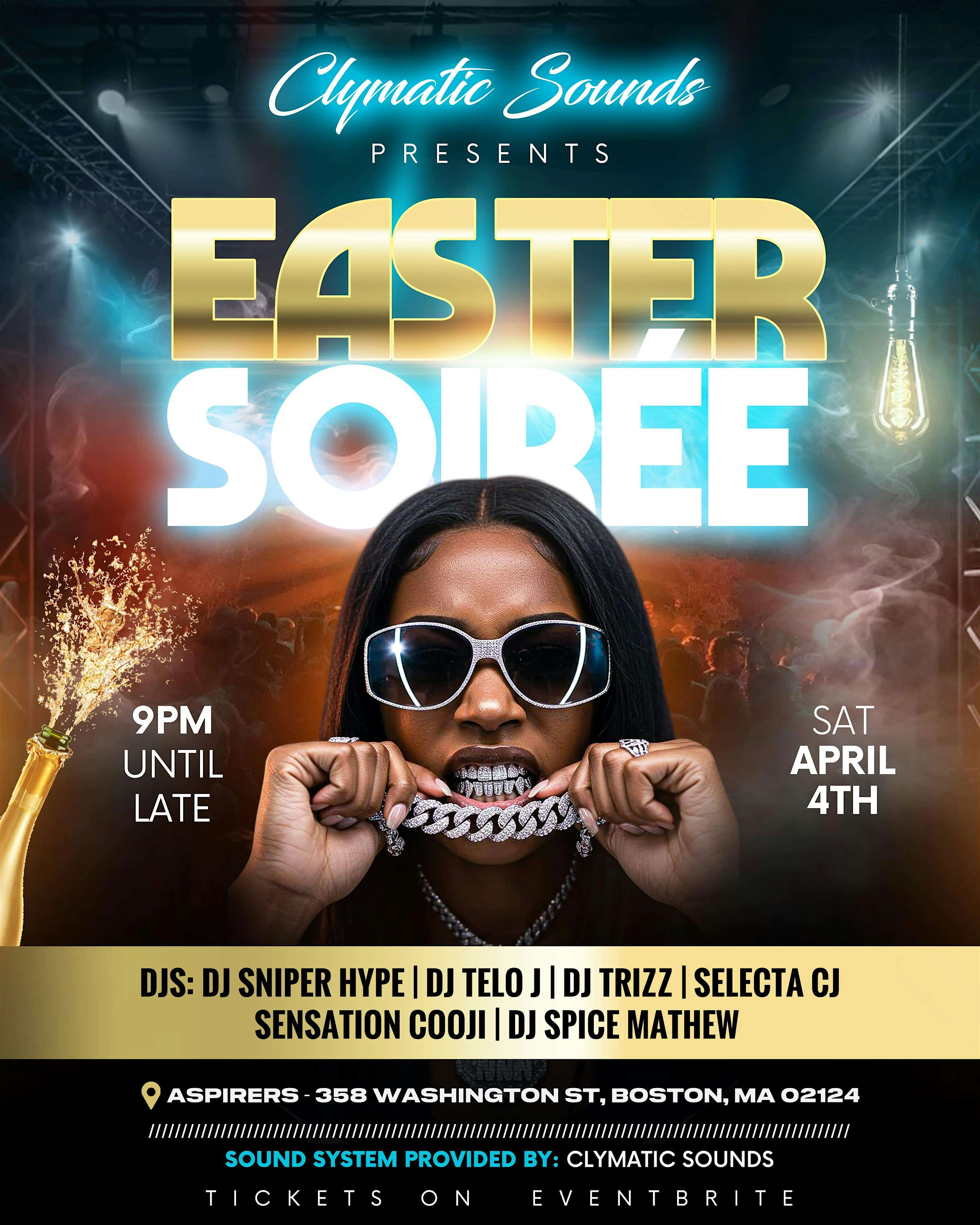 by admin23Feb Easter Soirée at Aspirers – Dorchester, MA Easter Soirée at Aspirers – Dorchester, MA 3 3 people viewed this event. Boston Easter Soirée. Multiple DJs, good music, and tropical chic vibes. Tickets-RSVP Link Date And Time Saturday, April 4th, 2026 09:00 PM (PST) Venue Aspirers Location 358 Washington Street, Dorchester, MA 2124 Event Types MusicParty or Social Gathering Event Category Massachusetts Share With Friends Facebook Twitter Linkedin Xing Pinterest Share This Post: