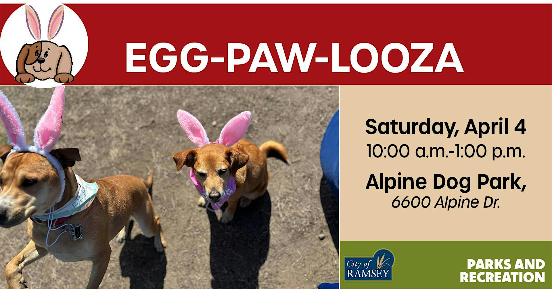 by admin13Feb Egg-Paw-Looza at Alpine Dog Park – Ramsey, MN Egg-Paw-Looza at Alpine Dog Park – Ramsey, MN 2 2 people viewed this event. Get ready for fun with an ‘Easter Egg Hunt’ designed for dogs with plenty of tennis balls scattered around to sniff out and play Tickets-RSVP Link Date And Time Saturday, April 4th, 2026 03:00 PM (PST) Venue Alpine Dog Park Location 6600 Alpine Drive, Ramsey, MN 55303 Event Types Party or Social Gathering Event Category Minnesota Share With Friends Facebook Twitter Linkedin Xing Pinterest Share This Post: