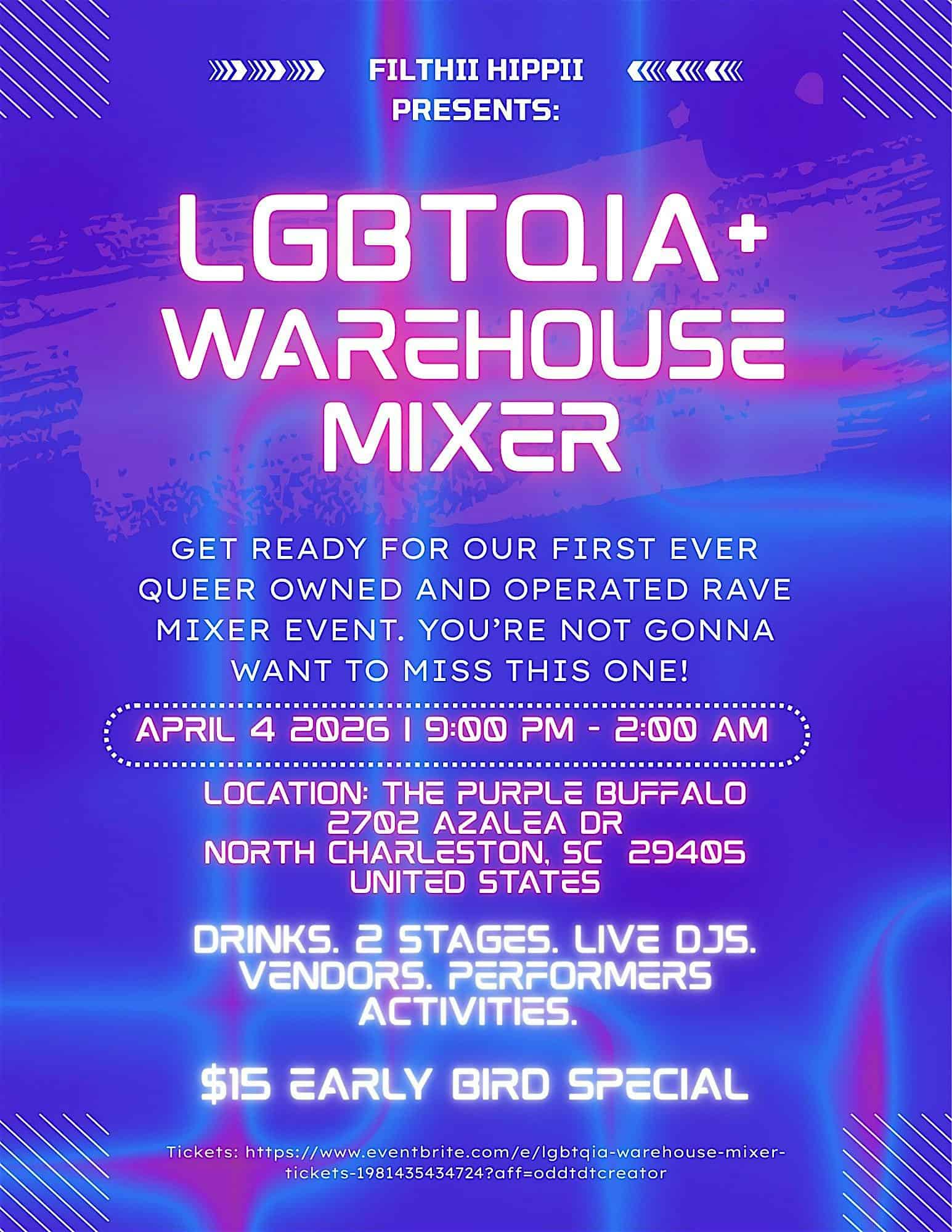 by admin23Feb LGBTQIA+ WareHOUSE Mixer at The Purple Buffalo – North Charleston, SC LGBTQIA+ WareHOUSE Mixer at The Purple Buffalo – North Charleston, SC 2 2 people viewed this event. Come hang out, connect, and celebrate all things LGBTQIA+ at the WareHOUSE Mixer—good vibes only! Tickets-RSVP Link Date And Time Saturday, April 4th, 2026 09:00 PM (PST) Venue The Purple Buffalo Location 2702 Azalea Drive, North Charleston, SC 29405 Event Types Community & CultureParty or Social Gathering Event Category CharlestonSouth Carolina Share With Friends Facebook Twitter Linkedin Xing Pinterest Share This Post: