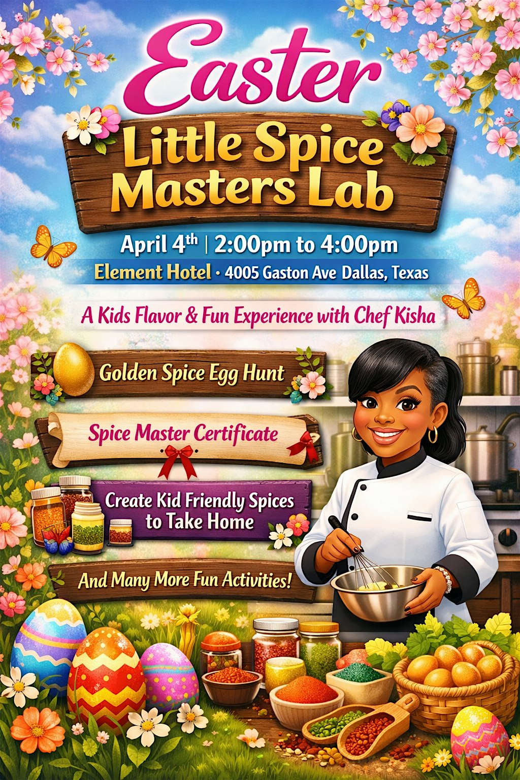 Little Spice Master Lab at 4005 Gaston Ave – Dallas, TX Little Spice Master Lab at 4005 Gaston Ave – Dallas, TX 2 2 people viewed this event. A hands-on spice adventure for kids! Create your own seasoning, play games, and become a Little Spice Master with Chef Kisha. Tickets-RSVP Link Register for event Date And Time Saturday, April 4th, 2026 @ 02:00 PM Location 4005 Gaston Avenue, Dallas, TX 75246 Event Types Class, Training, or WorkshopFood & Drink Event Category DallasTexas Share With Friends Facebook Twitter Linkedin Xing Pinterest