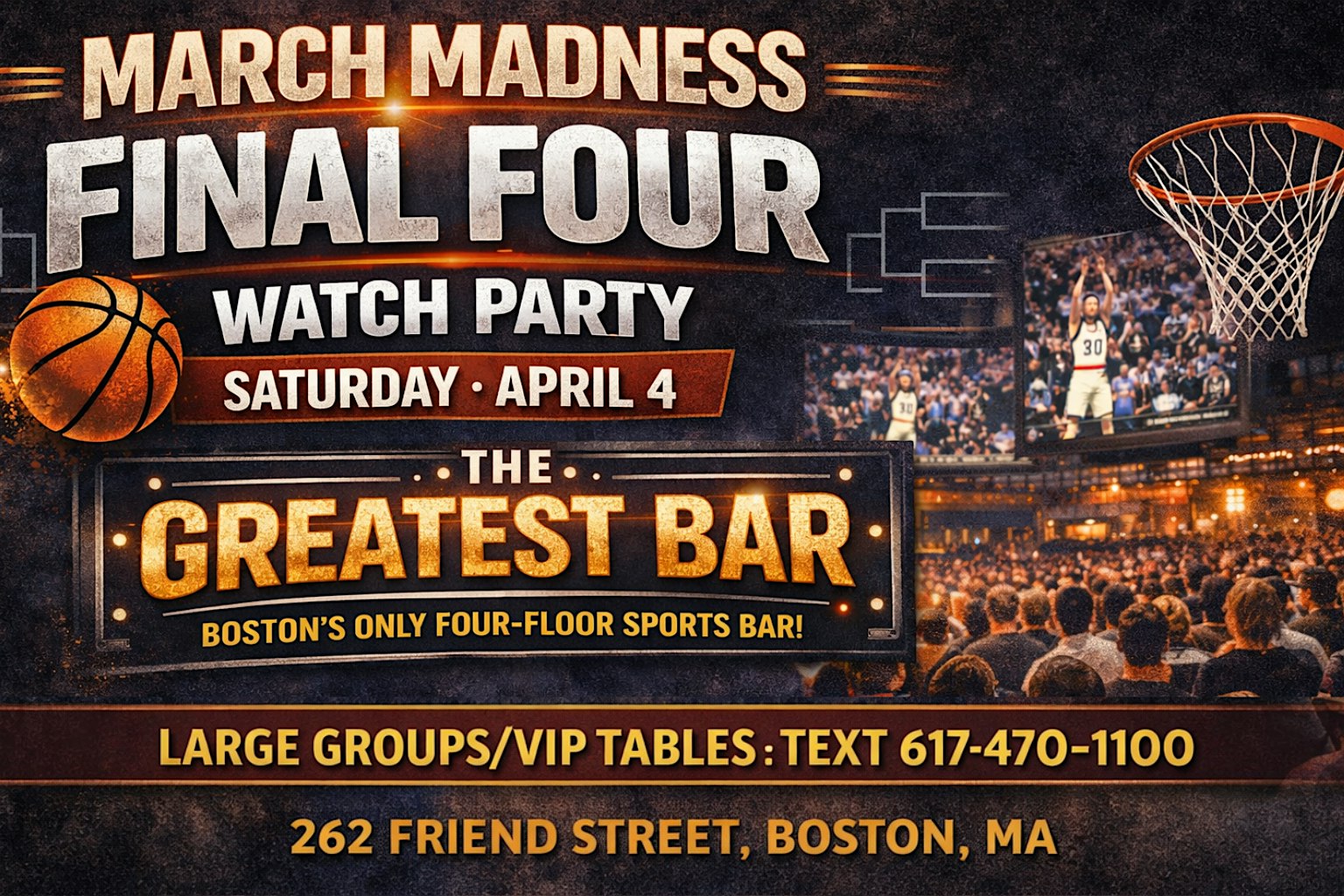 by admin13Feb March Madness Final Four Watch Party at The Greatest Bar at The Greatest Bar – Boston, MA March Madness Final Four Watch Party at The Greatest Bar at The Greatest Bar – Boston, MA 5 5 people viewed this event. March Madness Final Four at The Greatest Bar | 4 floors, massive TVs, food & drinks all night, DJ after the games | Saturday, April 4th Tickets-RSVP Link Date And Time Saturday, April 4th, 2026 07:00 PM (PST) Venue The Greatest Bar Location 262 Friend Street, Boston, MA 2114 Event Types Party or Social GatheringSports & Fitness Event Category BostonMassachusetts Share With Friends Facebook Twitter Linkedin Xing Pinterest Share This Post: