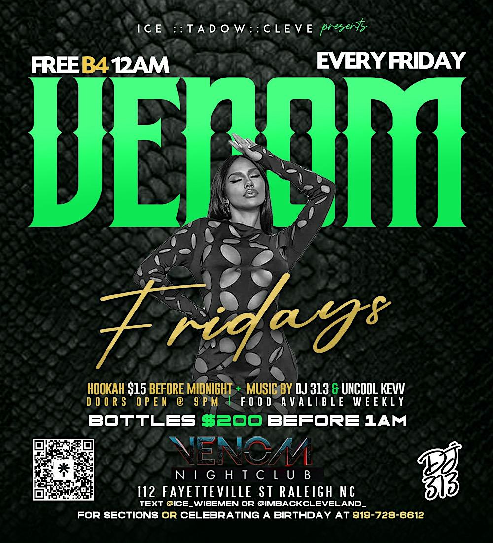 by admin13Feb Motion Fridays @ Venom at Venom Night Club – Raleigh, NC Motion Fridays @ Venom at Venom Night Club – Raleigh, NC 1 1 people viewed this event. Ladies Free w/RSVP Dm @ice_wisemen for sections or bdays call/txt 919-728-6612 Tickets-RSVP Link Date And Time Saturday, April 4th, 2026 02:00 AM (PST) Venue Venom Night Club Location 112 Fayetteville st, Raleigh, NC 27601 Event Types MusicParty or Social Gathering Event Category North CarolinaRaleigh Share With Friends Facebook Twitter Linkedin Xing Pinterest Share This Post: