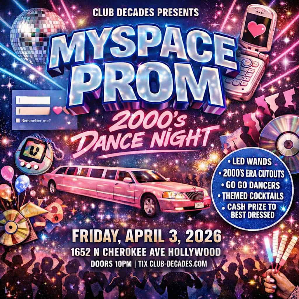 by admin14Feb MySpace Prom at Boardner’s by La Belle – Los Angeles, CA MySpace Prom at Boardner’s by La Belle – Los Angeles, CA 1 1 people viewed this event. Myspace Prom Tickets-RSVP Link Date And Time Saturday, April 4th, 2026 05:00 AM (PST) Venue Boardner's by La Belle Location 1652 North Cherokee Avenue, Los Angeles, CA 90028 Event Types Party or Social GatheringSeasonal & Holiday Event Category CaliforniaLos Angeles Share With Friends Facebook Twitter Linkedin Xing Pinterest Share This Post: