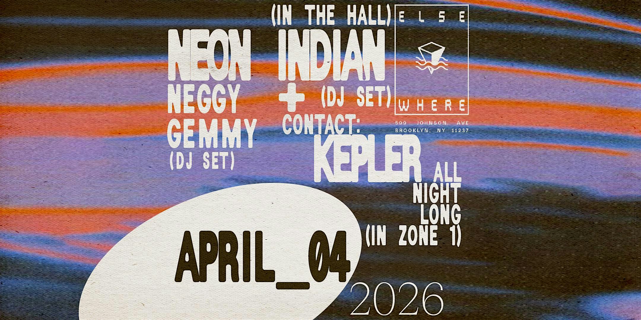 by admin24Feb Neon Indian (DJ Set), Neggy Gemmy (DJ Set), Contact: Kepler at Elsewhere – Brooklyn, NY Neon Indian (DJ Set), Neggy Gemmy (DJ Set), Contact: Kepler at Elsewhere – Brooklyn, NY 1 1 people viewed this event. Club night w/ Kepler @ Elsewhere in Bushwick on 4.04! Tickets start at $21 • 10:30pm • 21+ | Genre: Electronic Tickets-RSVP Link Date And Time Saturday, April 4th, 2026 10:00 PM (PST) Venue Elsewhere Location 599 Johnson Avenue, Brooklyn, NY 11237 Event Types Concert or PerformanceMusic Event Category New York Share With Friends Facebook Twitter Linkedin Xing Pinterest Share This Post: