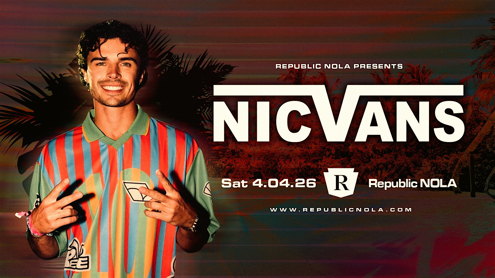 by admin24Feb Nic Vans at Republic NOLA – New Orleans, LA Nic Vans at Republic NOLA – New Orleans, LA 2 2 people viewed this event. Nic Vans from Love Island USA Season 7 Takes over Republic NOLA on Saturday 04.04.26! Tickets-RSVP Link Date And Time Saturday, April 4th, 2026 10:00 PM (PST) Venue Republic NOLA Location 828 S Peters St, New Orleans, LA 70130 Event Types Concert or PerformanceMusic Event Category LouisianaNew Orleans Share With Friends Facebook Twitter Linkedin Xing Pinterest Share This Post: