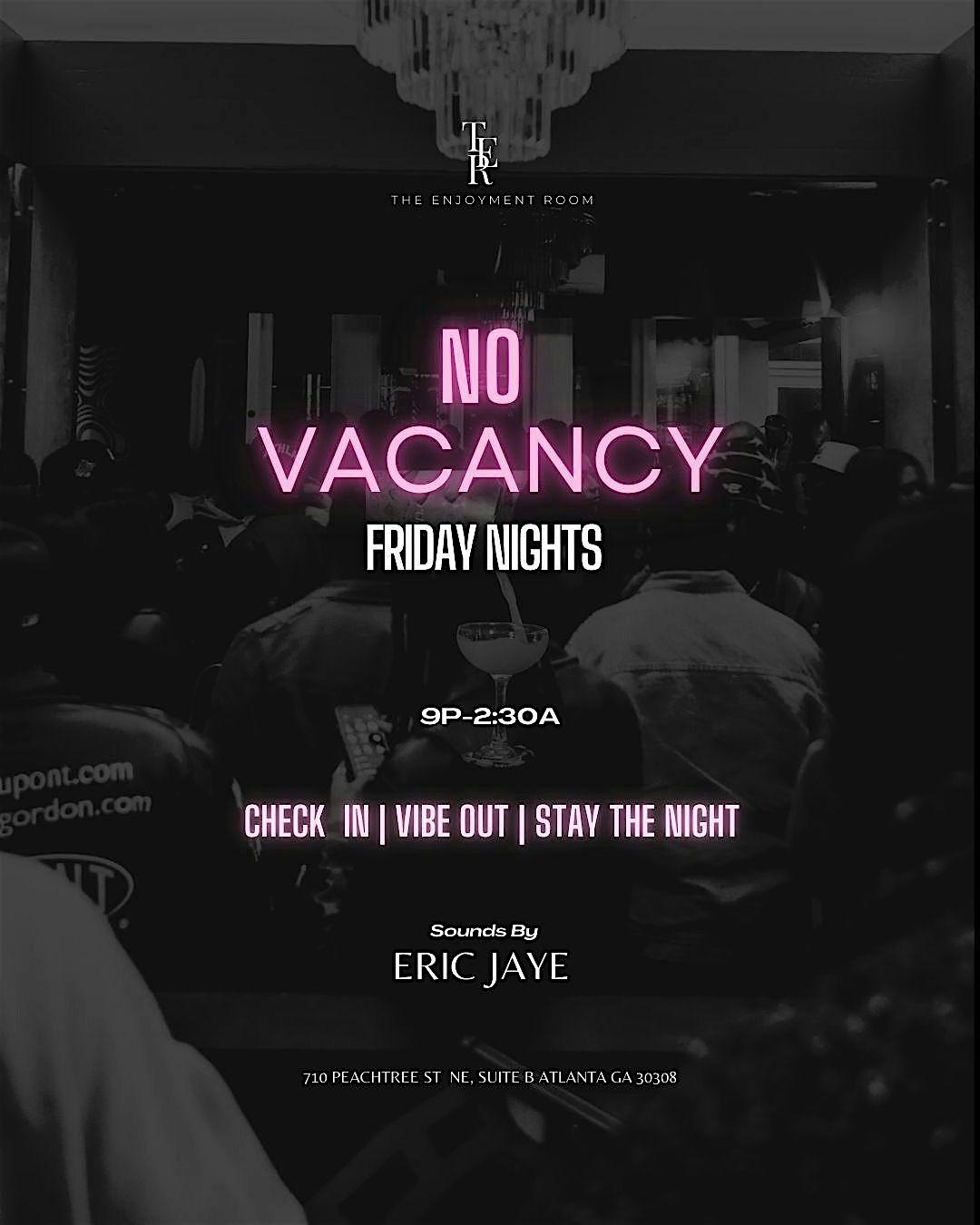 by admin24Feb NO VACANCY : FRIDAY NIGHTS at The Enjoyment Room – Atlanta, GA NO VACANCY : FRIDAY NIGHTS at The Enjoyment Room – Atlanta, GA 2 2 people viewed this event. Join us each & every Friday for “No Vacancy”. Kickstart the night and join us for our Early Check In Happy Hour 7p-10p then #StayTheNight Tickets-RSVP Link Date And Time Saturday, April 4th, 2026 07:00 PM (PST) Venue The Enjoyment Room Location 710 Peachtree St Ne, Atlanta, GA 30308 Event Types MusicParty or Social Gathering Event Category AtlantaGeorgia Share With Friends Facebook Twitter Linkedin Xing Pinterest Share This Post: