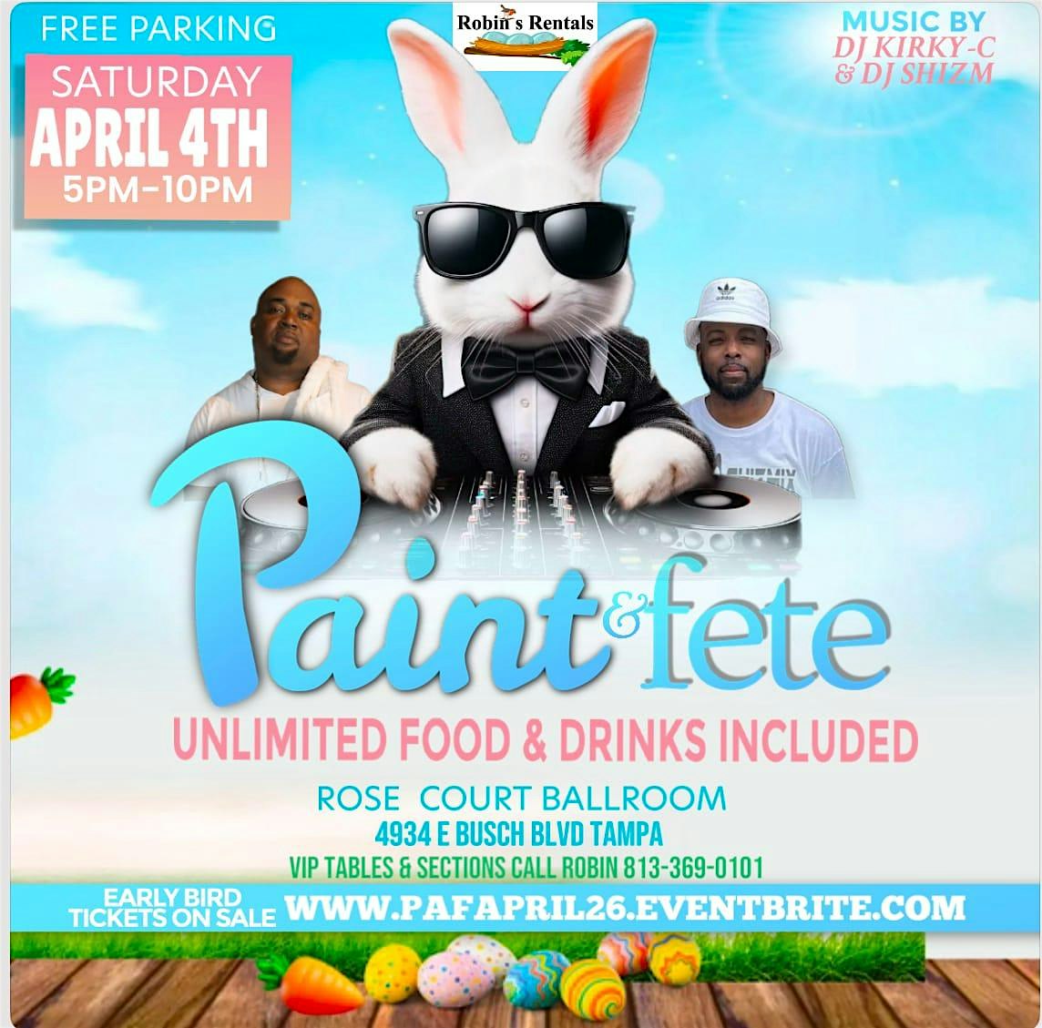 by admin13Feb PAINT AND FETE at The Rose Court Ballroom – Tampa, FL PAINT AND FETE at The Rose Court Ballroom – Tampa, FL 2 2 people viewed this event. Paint and DRANK party like no other! UNLIMITED drinks and some of the best Caribbean food you have ever had! LET’S PARTY! Tickets-RSVP Link Date And Time Saturday, April 4th, 2026 09:00 PM (PST) Venue The Rose Court Ballroom Location 4934 East Busch Boulevard, Tampa, FL 33617 Event Types Food & DrinkParty or Social Gathering Event Category FloridaTampa Share With Friends Facebook Twitter Linkedin Xing Pinterest Share This Post: