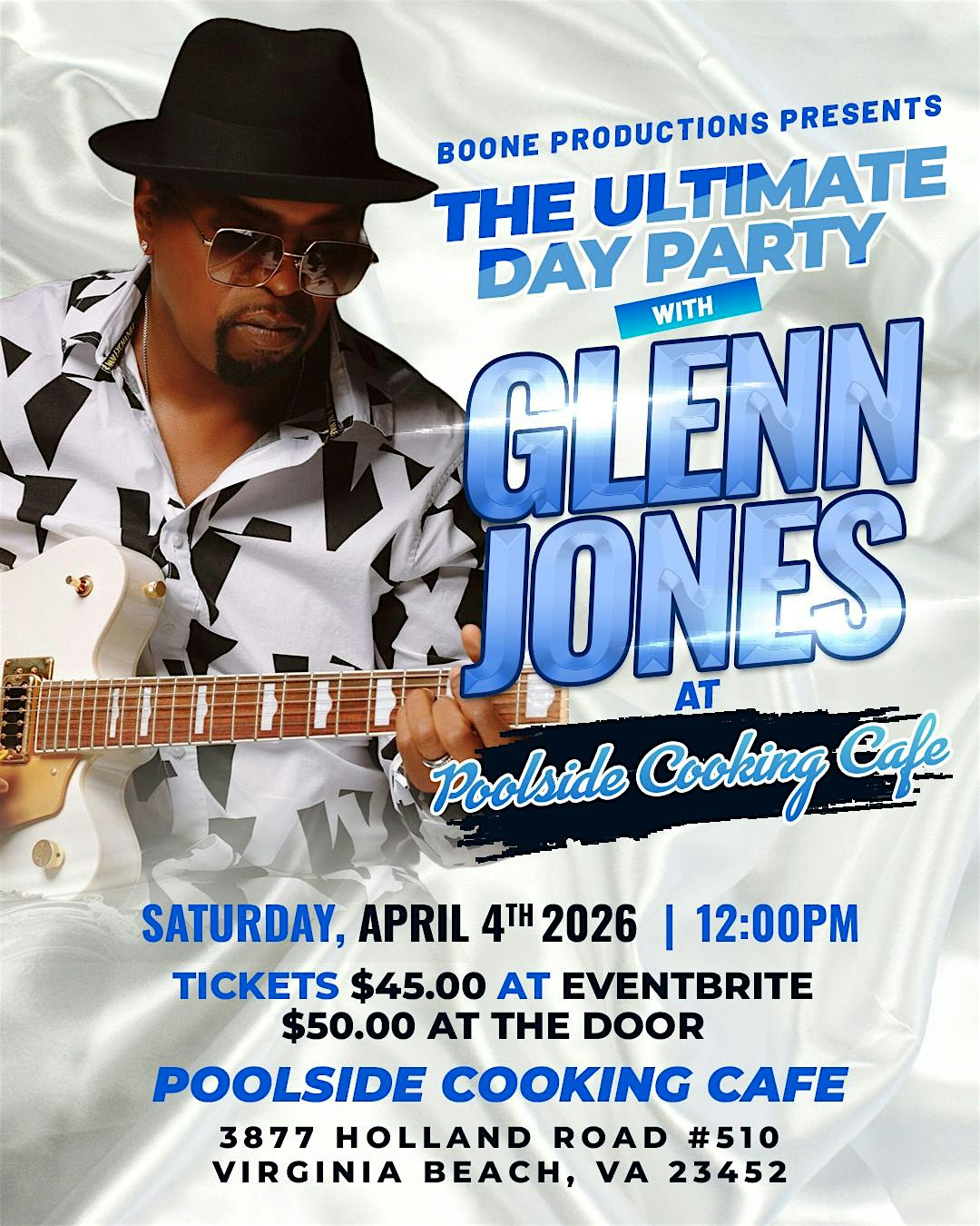 by admin24Feb R&B Music Legend Glenn Jones at Poolside Cooking TV Show. – Virginia Beach, VA R&B Music Legend Glenn Jones at Poolside Cooking TV Show. – Virginia Beach, VA 4 4 people viewed this event. Join us for the ultimate day party with R&B Legend Glenn Jones. He will be performing his classic hits and give a live interview. Tickets-RSVP Link Date And Time Saturday, April 4th, 2026 12:00 PM (PST) Venue Poolside Cooking TV Show. Location 3877 Holland Road, Virginia Beach, VA 23452 Event Types Concert or PerformanceMusic Event Category VirginiaVirginia Beach Share With Friends Facebook Twitter Linkedin Xing Pinterest Share This Post: