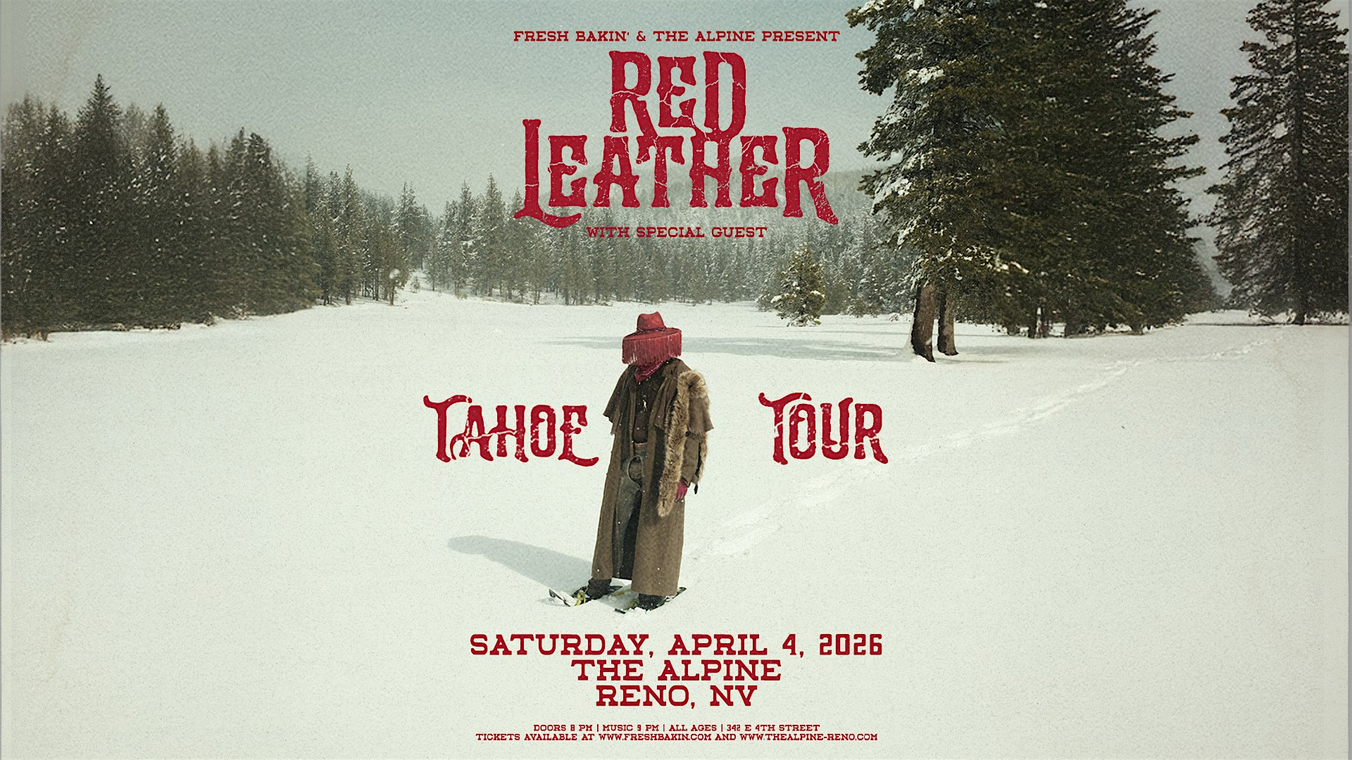 by admin24Feb Red Leather at The Alpine at The Alpine – Reno, NV Red Leather at The Alpine at The Alpine – Reno, NV 3 3 people viewed this event. Red Leather performs in Reno at The Alpine on April 4, 2026. Tickets-RSVP Link Date And Time Saturday, April 4th, 2026 09:00 PM (PST) Venue The Alpine Location 324 E 4th St, Reno, NV 89512 Event Types Concert or PerformanceMusic Event Category NevadaReno Share With Friends Facebook Twitter Linkedin Xing Pinterest Share This Post: