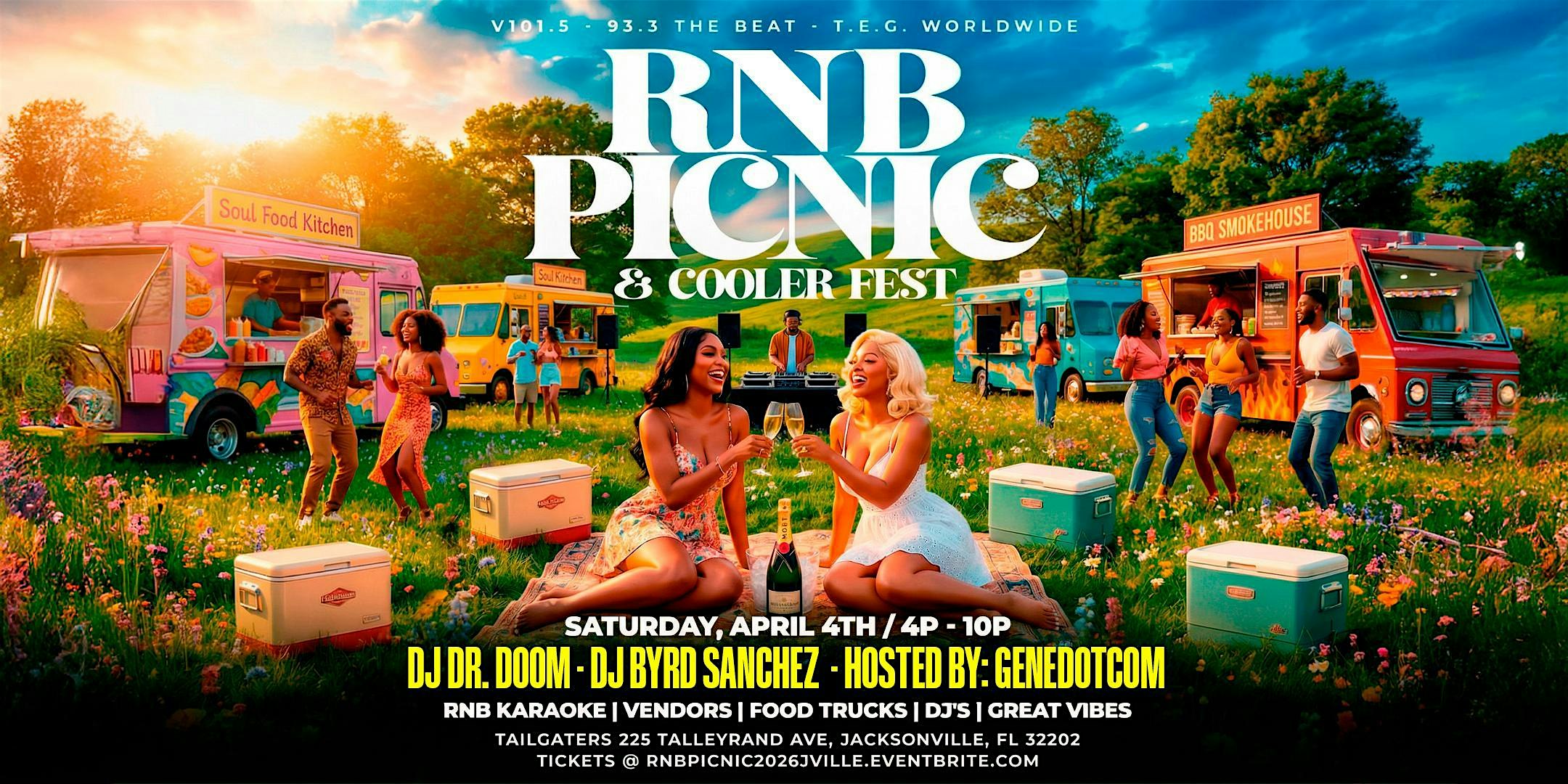 by admin24Feb RNB PICNIC & COOLER FEST at Tailgaters Parking – Jacksonville, FL RNB PICNIC & COOLER FEST at Tailgaters Parking – Jacksonville, FL 3 3 people viewed this event. V101.5, 93.3 THE BEAT & T.E.G. WORLDWIDE PRESENTS: Tickets-RSVP Link Date And Time Saturday, April 4th, 2026 04:00 PM (PST) Venue Tailgaters Parking Location 225 Talleyrand Avenue, Jacksonville, FL 32202 Event Types Festival or FairMusic Event Category FloridaJacksonville Share With Friends Facebook Twitter Linkedin Xing Pinterest Share This Post: