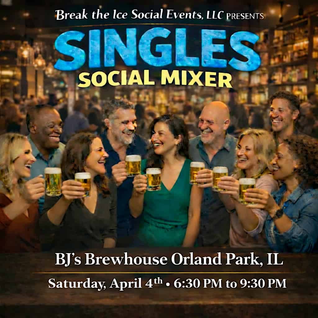 by admin23Feb Singles Social Mixer Orland Park, IL BJ’s Restaurant and Brewhouse at BJ’s Restaurant & Brewhouse – Orland Park, IL Singles Social Mixer Orland Park, IL BJ’s Restaurant and Brewhouse at BJ’s Restaurant & Brewhouse – Orland Park, IL 2 2 people viewed this event. These mixers are an excellent opportunity to meet new people for a fun night out. So leave the expectations at the door and have fun! Tickets-RSVP Link Date And Time Saturday, April 4th, 2026 06:00 PM (PST) Venue BJ's Restaurant & Brewhouse Location 15081 LaGrange Road, Orland Park, IL 60462 Event Types Food & DrinkParty or Social Gathering Event Category ChicagoIllinois Share With Friends Facebook Twitter Linkedin Xing Pinterest Share This Post: