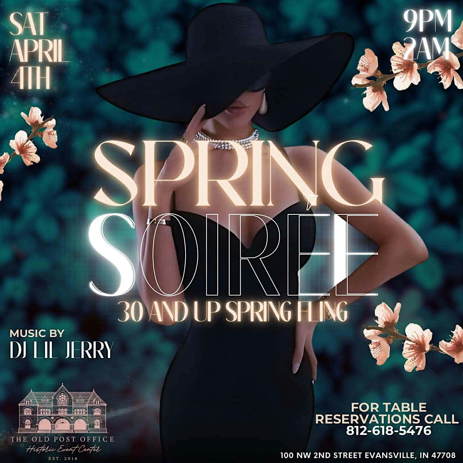 by admin23Feb SPRING SOIREE (30 And Up) at Old Post Office Event Center – Evansville, IN SPRING SOIREE (30 And Up) at Old Post Office Event Center – Evansville, IN 2 2 people viewed this event. Ages 30 and up Spring Fling. Come join us for this upscale event at an elegant venue. Tickets-RSVP Link Date And Time Saturday, April 4th, 2026 09:00 PM (PST) Venue Old Post Office Event Center Location 100 Northwest 2nd Street, Evansville, IN 47708 Event Types MusicParty or Social Gathering Event Category Indiana Share With Friends Facebook Twitter Linkedin Xing Pinterest Share This Post: