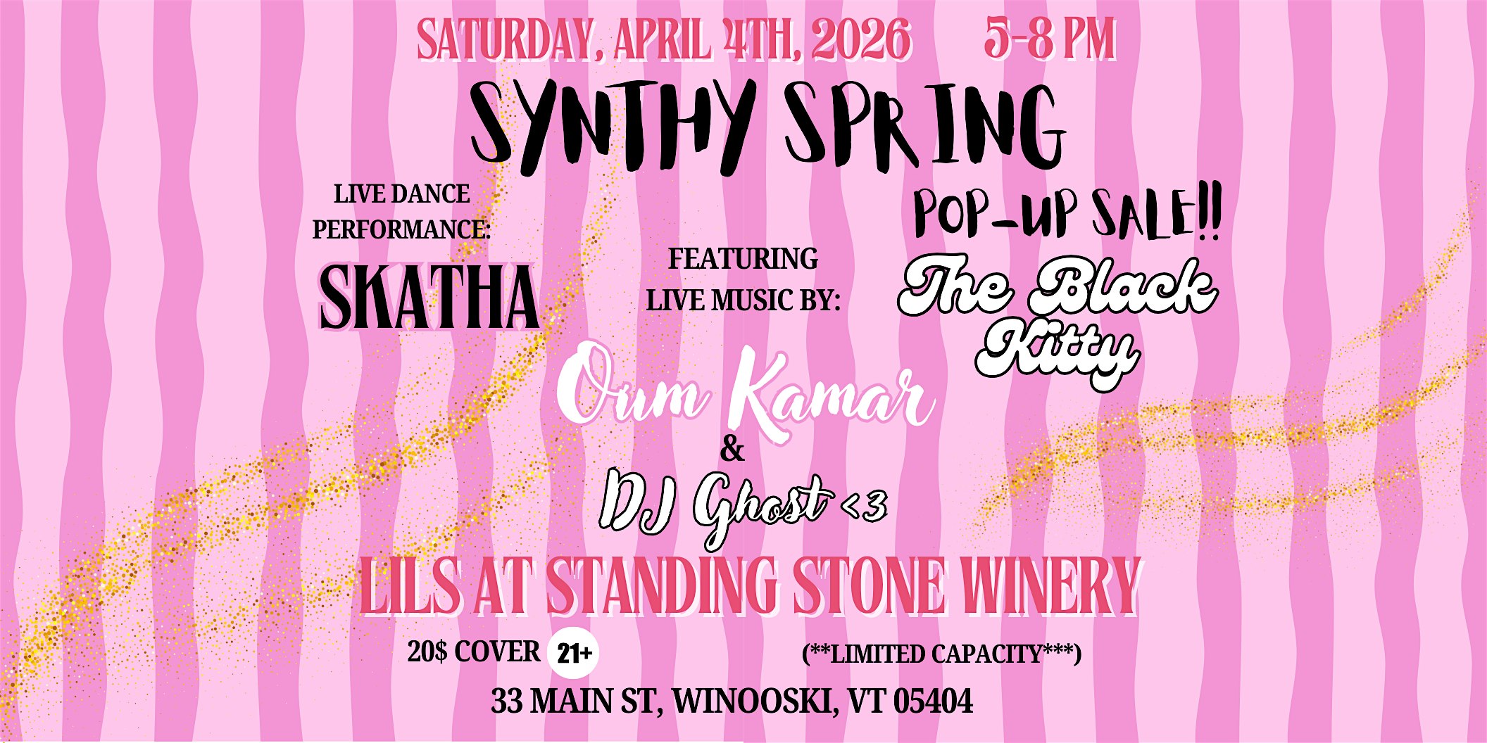 by admin24Feb Synthy Spring at Standing Stone Wines – Winooski, VT Synthy Spring at Standing Stone Wines – Winooski, VT 2 2 people viewed this event. Get ready to dance the night away under the stars at Synthy Spring, where the beats will be as fresh as the spring air! Tickets-RSVP Link Date And Time Saturday, April 4th, 2026 05:00 PM (PST) Venue Standing Stone Wines Location 33 Main Street, Winooski, VT 5404 Event Types Concert or PerformanceMusic Event Category Vermont Share With Friends Facebook Twitter Linkedin Xing Pinterest Share This Post: