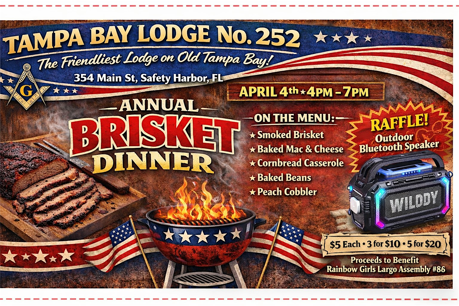 by admin24Feb Tampa Bay Lodge Annual Brisket Dinner at 354 Main St – Safety Harbor, FL Tampa Bay Lodge Annual Brisket Dinner at 354 Main St – Safety Harbor, FL 2 2 people viewed this event. Join Tampa Bay Lodge for our epic Brisket Dinner! Tender smoked brisket, creamy baked mac & cheese, golden cornbread casserole. Who’s in? Tickets-RSVP Link Date And Time Saturday, April 4th, 2026 04:00 PM (PST) Venue 354 Main St Location 354 Main Street, Safety Harbor, FL 34695 Event Types Food & Drink Event Category ClearwaterFlorida Share With Friends Facebook Twitter Linkedin Xing Pinterest Share This Post: