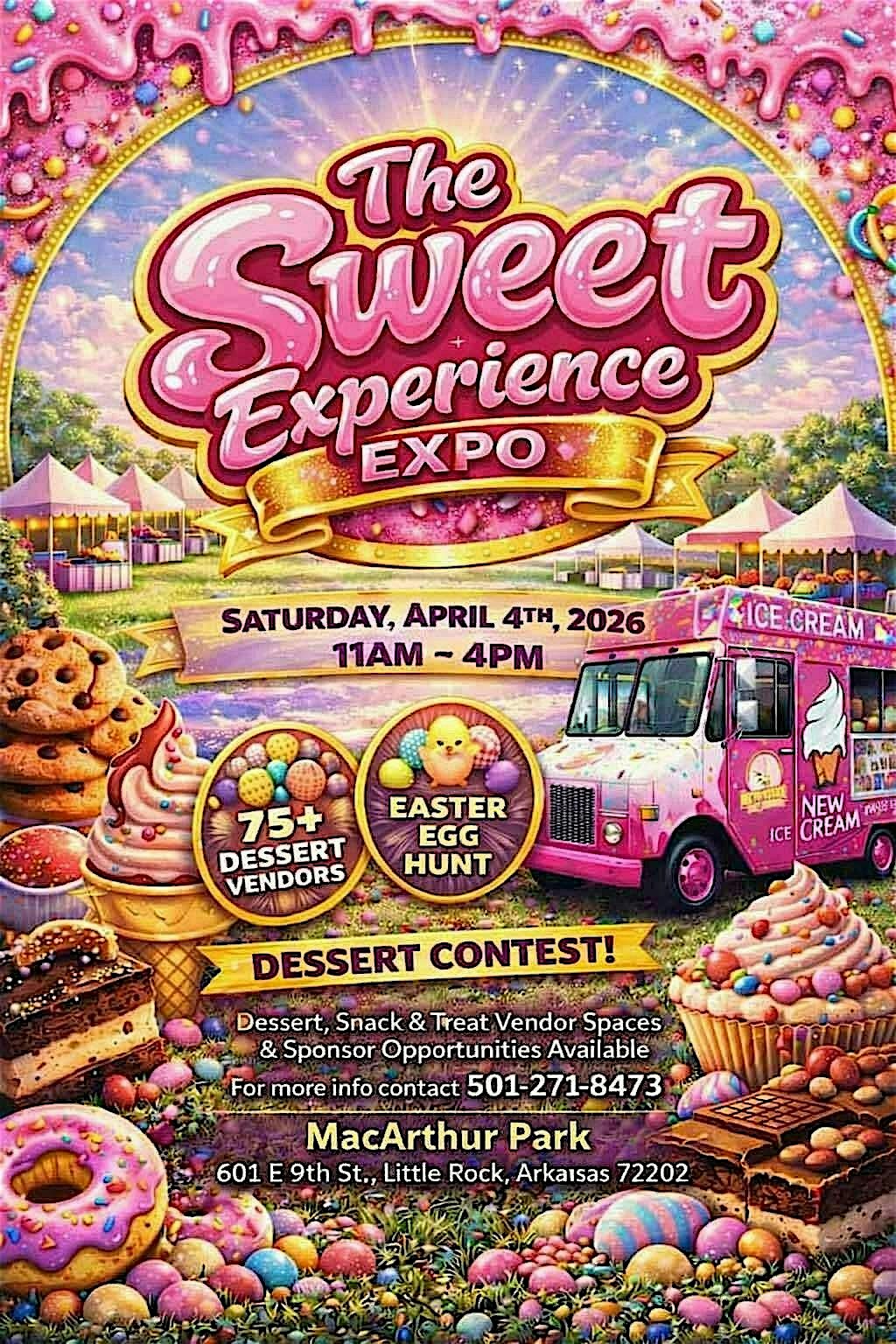 by admin24Feb The Sweet Experience Expo at MacArthur Park – Little Rock, AR The Sweet Experience Expo at MacArthur Park – Little Rock, AR 3 3 people viewed this event. Sweets, snacks, family fun & an outdoor Easter Egg Hunt — welcome to The Sweet Experience Expo! Tickets-RSVP Link Date And Time Saturday, April 4th, 2026 11:00 AM (PST) Venue MacArthur Park Location 601 East 9th Street, Little Rock, AR 72202 Event Types Food & Drink Event Category ArkansasLittle Rock Share With Friends Facebook Twitter Linkedin Xing Pinterest Share This Post: