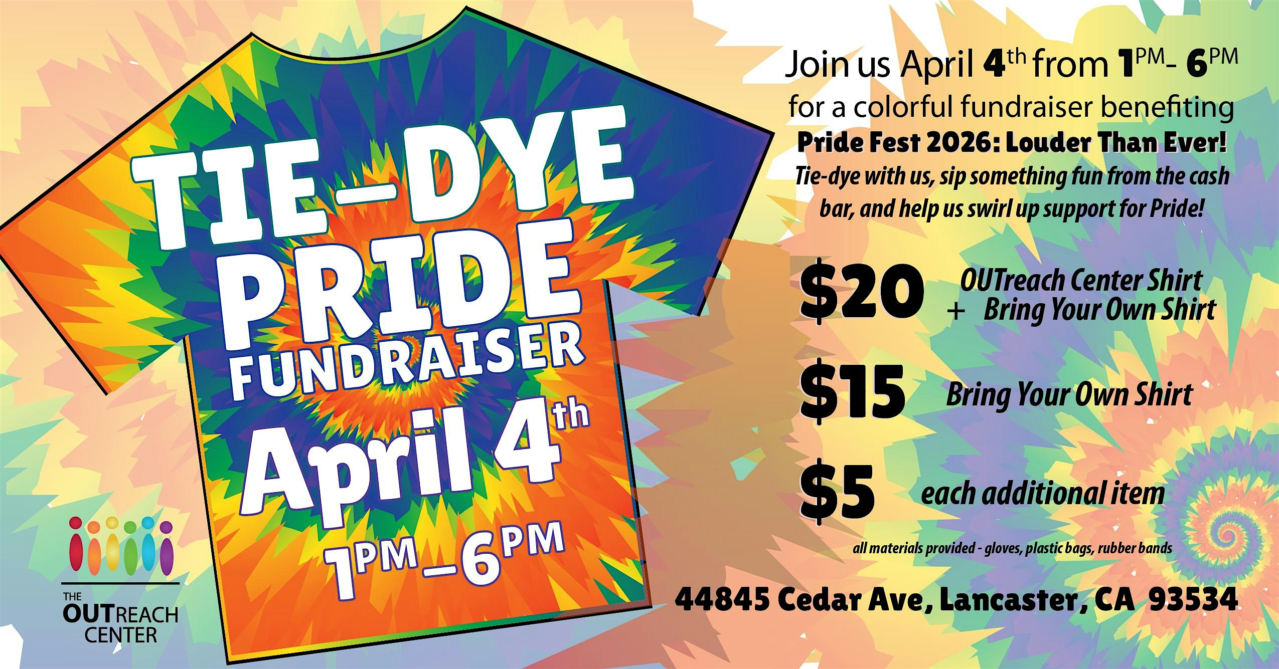 by admin27Feb Tie-Dye Pride Fundraiser at 44845 Cedar Ave – Lancaster, CA Tie-Dye Pride Fundraiser at 44845 Cedar Ave – Lancaster, CA 2 2 people viewed this event. Join us for a colorful fundraiser benefiting Pride Fest 2026: Louder Than Ever! Tie-dye with us, sip something un from the cash bar Tickets-RSVP Link Date And Time Saturday, April 4th, 2026 @ 01:00 PM Location 44845 Cedar Avenue, Lancaster, CA 93534 Event Types Charity & CausesParty or Social Gathering Event Category California Share With Friends Facebook Twitter Linkedin Xing Pinterest Share This Post: