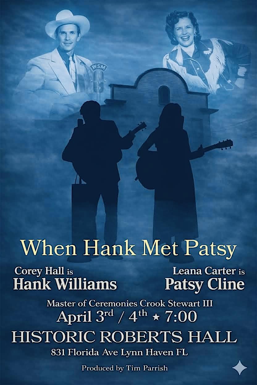by admin27Feb When Hank Met Patsy at Roberts Hall – Lynn Haven, FL When Hank Met Patsy at Roberts Hall – Lynn Haven, FL 2 2 people viewed this event. Come to historic Roberts Hall to see what might have happened if Hank Williams Sr and Patsy Cline had met and performed together! Tickets-RSVP Link Date And Time Saturday, April 4th, 2026 07:00 PM (PST) Venue Roberts Hall Location 831 Florida Avenue, Lynn Haven, FL 32444 Event Types Concert or PerformanceMusic Event Category Florida Share With Friends Facebook Twitter Linkedin Xing Pinterest Share This Post: