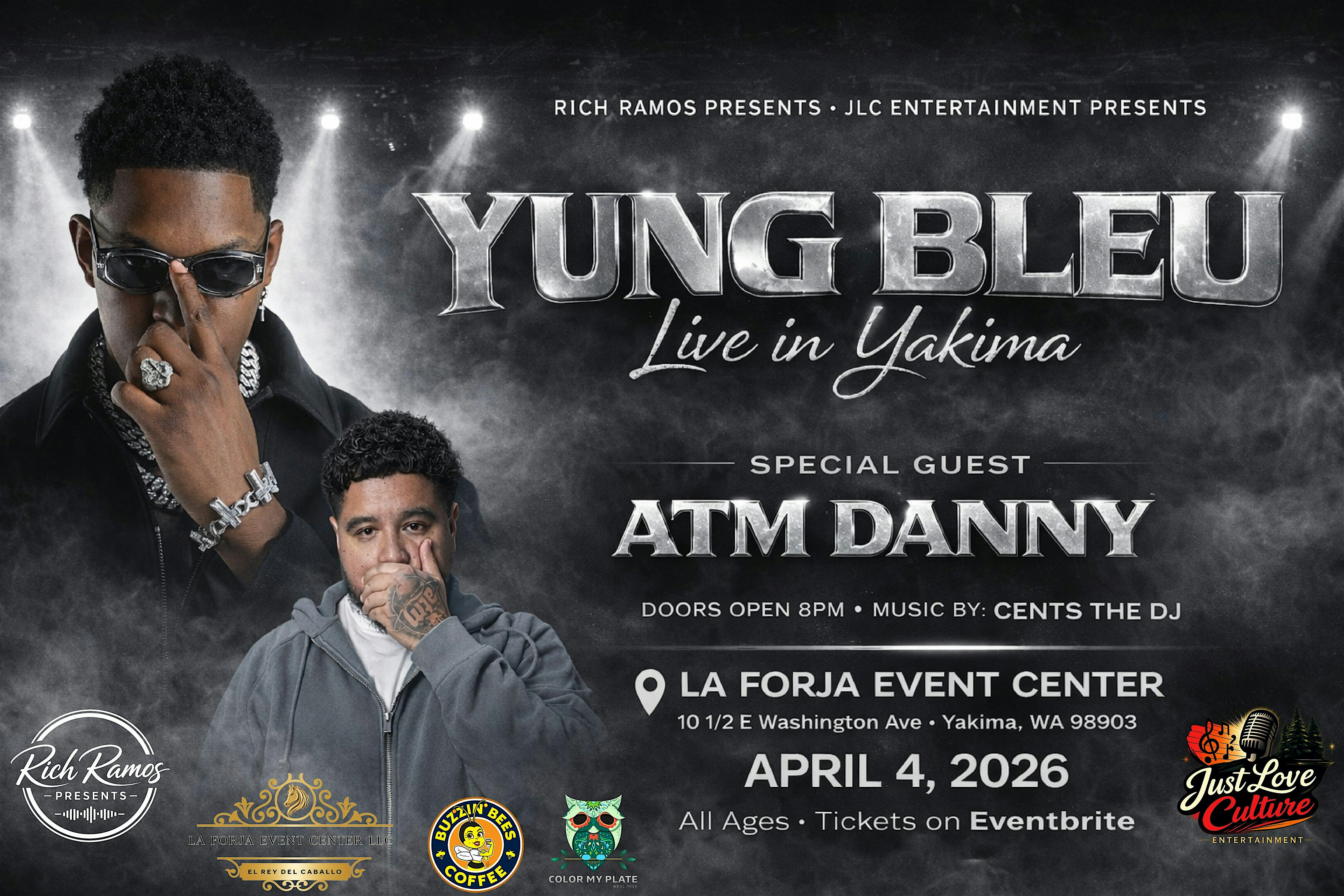 by admin24Feb Yung Bleu – Live in Yakima with Special Guest ATM Danny at La Forja Event Center – Yakima, WA Yung Bleu – Live in Yakima with Special Guest ATM Danny at La Forja Event Center – Yakima, WA 4 4 people viewed this event. Catch Yung Bleu live in Yakima with special guest ATM Danny! Tickets-RSVP Link Date And Time Saturday, April 4th, 2026 08:00 PM (PST) Venue La Forja Event Center Location 10 1/2 East Washington Avenue, Yakima, WA 98903 Event Types Concert or PerformanceMusic Event Category Washington Share With Friends Facebook Twitter Linkedin Xing Pinterest Share This Post: