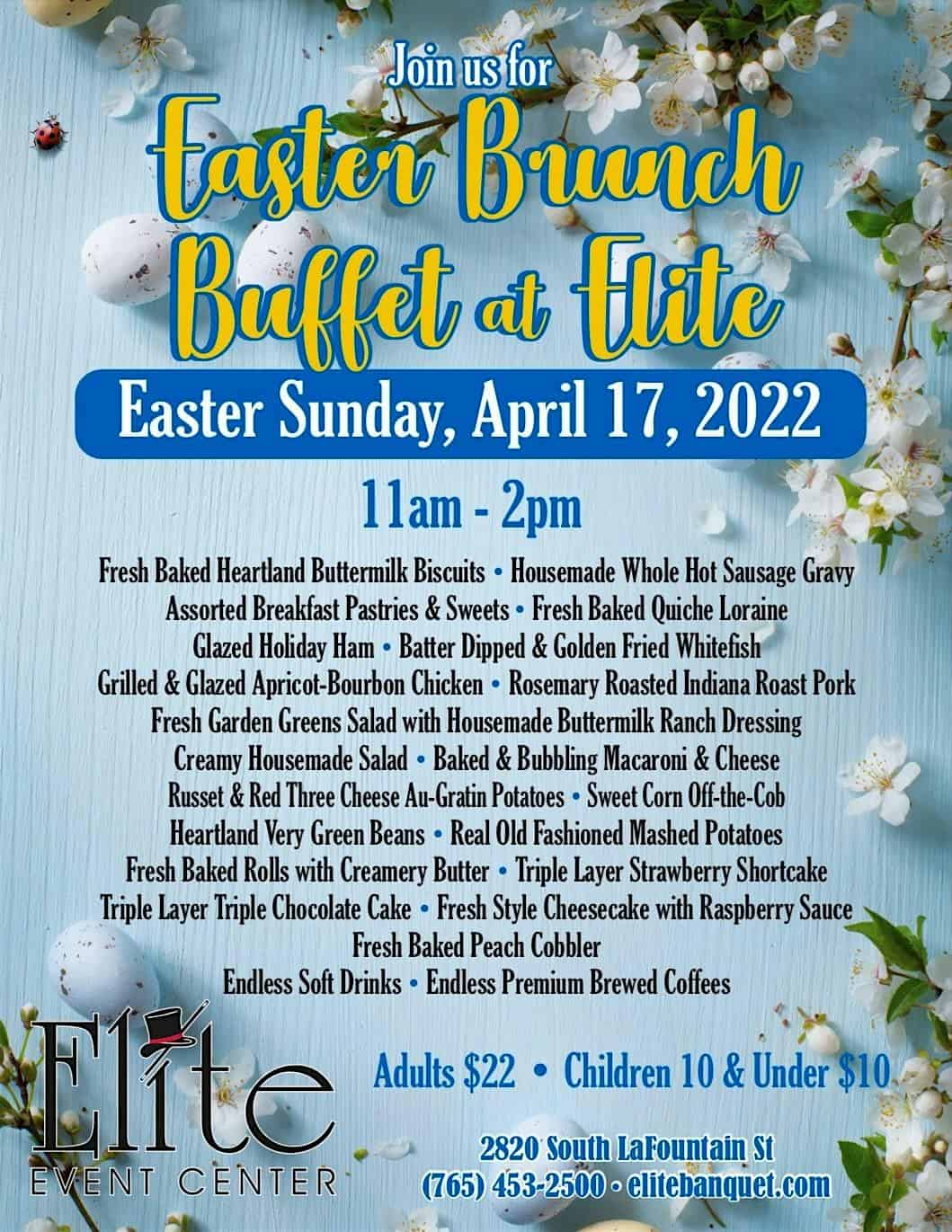 by admin14Feb An Elite Easter 2026 at Elite Event Center – Kokomo, IN An Elite Easter 2026 at Elite Event Center – Kokomo, IN 1 1 people viewed this event. An Elite All You Can Eat Buffet of Deliciousness, 11am Arrival Time Tickets-RSVP Link Date And Time Sunday, April 5th, 2026 03:00 PM (PST) Venue Elite Event Center Location 2820 South Lafountain Street, Kokomo, IN 46902 Event Types Food & Drink Event Category Indiana Share With Friends Facebook Twitter Linkedin Xing Pinterest Share This Post:
